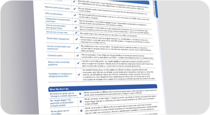 COMPENSATIONDISCUSSIONANDANALYSIS ExecutiveSummary KeyCompensationPoliciesandPractices Wemaintainthefollowingpoliciesandpracticesthatwebelievedemonstrateourcommitmenttogoodcorporate governanceandexecutivecompensationbestpractices. What We Do PRO XY S More than 50% of our NEOs Target Total Direct Compensation is performance-based and tied to T Pay for Performance A pre-established performance goals aligned with our short-term and long-term objectives. TEMENT Rigorous performance goals We use objective performance-based Company goals that are designed to be rigorous in our incentive plans. ESG considerations We incorporate ESG considerations, such as risk and compliance and DIE&B, into our executive compensation program. Independent compensation The Compensation Committee engages its own independent compensation consultant to consultant advise on executive and director compensation matters. Annual compensation The Compensation Committee annually reviews the composition of our compensation peer peer group review group to evaluate whether the peer group remains appropriate in light of our size and industry. Annual say-on-pay vote We conduct an annual advisory say-on-pay vote on our NEO compensation. We are committed to ongoing engagement with our stockholders—including on executive Stockholder engagement compensation, corporate governance and ESG matters—through teleconferences, in-person meetings and correspondence. Annual compensation risk We conduct an annual compensation risk assessment to evaluate whether our executive assessment compensation program presents any risks that are reasonably likely to have a material adverse effect on PayPal. Clawback policy The Compensation Committee can require forfeiture or reimbursement of incentive compensation paid or awarded to our NEOs in certain circumstances under our clawback policy. Robust stock ownership Our stock ownership guidelines require significant sustained ownership of PayPal common guidelines stock to align the long-term interests of our NEOs and non-employee directors with those of our stockholders and promote our commitment to sound corporate governance. Our insider trading policy, which applies to all Board members, executive officers and Prohibition of hedging and employees, prohibits the use of hedging and monetization transaction relating to our securities pledging transactions and the use of PayPal derivative securities as collateral in a margin account or for any loan or extension of credit. Board members and executive officers are prohibited, and all other employees are strongly discouraged, from pledging any PayPal securities as collateral for loans. What We Dont Do No excise tax gross-ups on We do not provide our NEOs with any excise tax gross-ups or other payment or reimbursement of “change in control” payments excise taxes on severance in connection with a change in control of PayPal. No “single-trigger” CIC We do not make “single-trigger” change-in-control payments or maintain any plans that require payments or acceleration single-trigger change-in-control acceleration of equity awards to our NEOs upon a change in of equity awards control of PayPal. No tax gross-ups on We do not provide our NEOs with any tax gross-ups on perquisites, other than in limited perquisites circumstances for business-related relocation and international business travel-related benefits that are under our control, at our direction, and deemed to benefit our business operations. No discounting of stock Our equity compensation plan expressly prohibits the discounting of the exercise price of stock options or repricing of options and the repricing of underwater stock options without stockholder approval. underwater options No guaranteed bonuses Our AIP is entirely performance-based, and our NEOs are not guaranteed any minimum levels of payment under that plan. •2023ProxyStatement 53