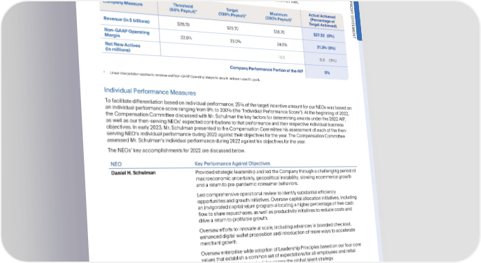 COMPENSATIONDISCUSSIONANDANALYSIS AnnualIncentivePlan In January 2022, the CompensationCommitteeestablishedthreshold,targetandmaximumperformancegoalsforthe revenueandNon-GAAPOperatingMarginmeasuresandatargetgoalfortheNNAmeasure,basedprimarilyonour approvedbudgetandoperatingplanfortheyearandfullyearguidanceprovidedtotheinvestmentcommunity.Thetable belowshowstheperformancegoalsforthe2022AIPapplicabletotheNEOsandtheactualperformanceachieved.There wasnopayoutwithrespecttotheCompanyperformanceportionofthe2022AIPforourNEOsbecausetheminimum PRO thresholdsfor the revenueandNon-GAAPOperatingMarginperformancemeasureswerenotmet. XY S T Actual Achieved A Company Measure Threshold Target Maximum (Percentage of TEMENT (50% Payout)* (100% Payout)* (200% Payout)* Target Achieved) Revenue (in $ billions) $28.70 $29.70 $30.70 $27.52 (0%) Non-GAAP Operating 22.0% 23.0% 24.0% 21.3% (0%) Margin Net New Actives 18.0 8.6 (0%) (in millions) Company Performance Portion of the AIP 0% * Linear interpolationapplies to revenueand Non-GAAPOperatingMarginforresultsbetweenspecificgoals. Individual PerformanceMeasures Tofacilitate differentiation based on individual performance,25% of the target incentive amount for our NEOs was based on anindividualperformancescorerangingfrom0%to200%(the“IndividualPerformanceScore”).Atthebeginningof2022, theCompensationCommitteediscussedwithMr.Schulmanthekeyfactorsfordeterminingawardsunderthe2022AIP, aswellasourthen-servingNEOsexpectedcontributionstothatperformanceandtheirrespectiveindividualbusiness objectives.In early 2023, Mr. Schulman presentedto the CompensationCommitteehisassessmentofeachofthethen- servingNEOsindividualperformanceduring2022againsttheirobjectivesfortheyear.TheCompensationCommittee assessedMr.Schulmansindividualperformanceduring2022againsthisobjectivesfortheyear. TheNEOskeyaccomplishmentsfor2022arediscussedbelow. NEO KeyPerformanceAgainstObjectives DanielH.Schulman ProvidedstrategicleadershipandledtheCompanythroughachallengingperiodof macroeconomicuncertainty,geopoliticalinstability,slowingecommercegrowth andareturntopre-pandemicconsumerbehaviors. Ledcomprehensiveoperationalreviewtoidentifysubstantialefficiency opportunitiesandgrowthinitiatives.Oversawcapitalallocationinitiatives,including aninvigoratedcapitalreturnprogramallocatingahigherpercentageoffreecash flow to share repurchases,as well as productivityinitiatives to reduce costs and drive a return to profitable growth. Oversaweffortstoinnovateatscale,includingadvancesinbrandedcheckout, enhanceddigitalwalletpropositionandintroductionofmorewaystoaccelerate merchantgrowth. Oversawenterprise-wideadoptionofLeadershipPrinciplesbasedonourfourcore valuesthatestablishacommonsetofexpectationsforallemployeesandinitial stepstointegratetheseprinciplesacrosstheglobaltalentstrategy. Oversawcontinuingevolutionofemployeeworkexperience,includingnormalizing post-COVIDworkingconditions(includingbalancingworkfromhomeandoffice reopenings),furtheringemployeewellnessinitiativesandprovidingsupportto employeesthroughouttheirfullemploymentcycle. •2023ProxyStatement 59