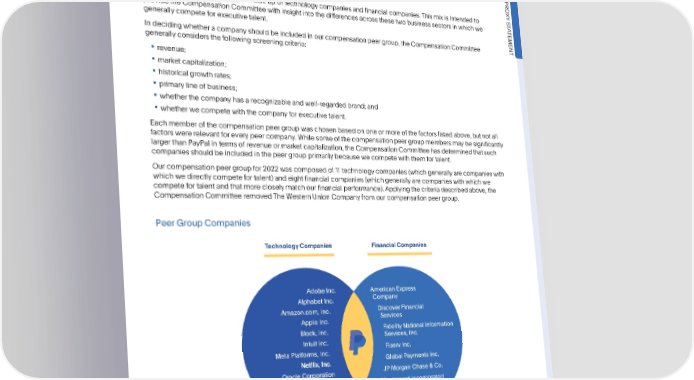 COMPENSATIONDISCUSSIONANDANALYSIS OurStructurefor Setting Compensation WhilecertainmembersofmanagementattendedthemeetingsoftheCompensationCommitteein2022byinvitation,they didnotattendexecutivesessionsofthemeetingsorportionsofCompensationCommitteemeetingsduringwhichtheir individual compensationwasdiscussedorapproved. OurCompensationPeerGroup PRO XY S Ourcompensationpeergroupismadeupoftechnologycompaniesandfinancialcompanies.Thismixisintendedto T A providetheCompensationCommitteewithinsightintothedifferencesacrossthesetwobusinesssectorsinwhichwe TEMENT generallycompeteforexecutivetalent. In decidingwhetheracompanyshouldbeincludedinourcompensationpeergroup,theCompensationCommittee generallyconsidersthefollowingscreeningcriteria: • revenue; • marketcapitalization; • historical growth rates; • primaryline of business; • whetherthecompanyhasarecognizableandwell-regardedbrand;and • whetherwecompetewiththecompanyforexecutivetalent. Eachmemberofthecompensationpeergroupwaschosenbasedononeormoreofthefactorslistedabove,butnotall factors were relevant for every peer company.While some of the compensationpeergroupmembersmaybesignificantly larger than PayPal in terms of revenue or market capitalization,the CompensationCommitteehas determinedthatsuch companiesshouldbeincludedinthepeergroupprimarilybecausewecompetewiththemfortalent. Ourcompensationpeergroupfor2022wascomposedof11technologycompanies(whichgenerallyarecompanieswith whichwedirectlycompetefortalent)andeightfinancialcompanies(whichgenerallyarecompanieswithwhichwe competefortalentandthatmorecloselymatchourfinancialperformance).Applyingthecriteriadescribedabove,the CompensationCommitteeremovedTheWesternUnionCompanyfromourcompensationpeergroup. PeerGroupCompanies Technology Companies Financial Companies Adobe Inc. American Express Alphabet Inc. Company Amazon.com, Inc. Discover Financial Apple Inc. Services Block, Inc. Fidelity National Information Intuit Inc. Services, Inc. Meta Platforms, Inc. Fiserv Inc. Global Payments Inc. Oracle Corporation JP Morgan Chase & Co. Salesforce, Inc. Mastercard Incorporated ServiceNow, Inc. Visa Inc. In contemplatingourexecutivecompensationprogramfor2022andgoingforward,theCompensationCommittee consideredthecompensationprogramsofourcompensationpeergroupaswellasourgoalsofrewardingperformance andretainingcoretoptalent.Wealsocompareourperformanceagainsttheperformanceofcompaniesinour compensationpeergroupthatwebelievehaverelativelycomparablebusinessmodels.Ourexecutivecompensation programisgenerallydesignedtoroughlyparalleltheprogramsofmembersofourcompensationpeergroupbecauseour employeeshavehistoricallybeenrecruitedbythesecompetitors. •2023ProxyStatement 67
