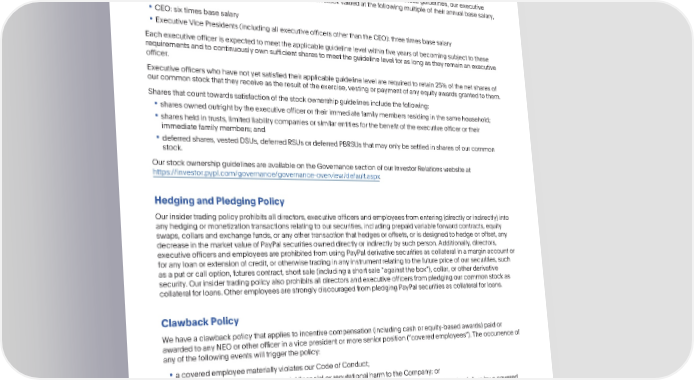 COMPENSATIONDISCUSSIONANDANALYSIS OtherCompensationPracticesandPolicies OtherCompensationPracticesandPolicies StockOwnershipGuidelines OurBoardhasadoptedstockownershipguidelinesdesignedtocloselyaligntheinterestsofourseniorleadershipteam (including our executiveofficers) with the long-term interests of our stockholders.Under these guidelines,our executive officers are required to achieve ownershipof our commonstockvaluedatthefollowingmultipleof theirannualbasesalary, asapplicable: • CEO:sixtimesbasesalary • ExecutiveVicePresidents(includingall executiveofficersotherthantheCEO):threetimesbasesalary Eachexecutiveofficerisexpectedtomeettheapplicableguidelinelevelwithinfiveyearsofbecomingsubjecttothese requirementsandtocontinuouslyownsufficientsharestomeettheguidelinelevelforaslongastheyremainanexecutive officer. Executiveofficerswhohavenotyetsatisfiedtheirapplicableguidelinelevelarerequiredtoretain25%ofthenetsharesof ourcommonstockthattheyreceiveastheresultoftheexercise,vestingorpaymentofanyequityawardsgrantedtothem. Sharesthatcounttowardssatisfactionofthestockownershipguidelinesincludethefollowing: • sharesownedoutrightbytheexecutiveofficerortheirimmediatefamilymembersresidinginthesamehousehold; • sharesheldintrusts,limitedliability companiesor similar entities for the benefit of the executive officer or their immediatefamilymembers;and • deferredshares,vestedDSUs,deferredRSUsordeferredPBRSUsthatmayonlybesettledinsharesofourcommon stock. OurstockownershipguidelinesareavailableontheGovernancesectionofourInvestorRelationswebsiteat https://investor.pypl.com/governance/governance-overview/default.aspx. HedgingandPledgingPolicy Ourinsidertradingpolicyprohibitsall directors,executiveofficersand employeesfromentering(directlyor indirectly)into anyhedgingormonetizationtransactionsrelatingtooursecurities,includingprepaidvariableforwardcontracts,equity swaps,collarsandexchangefunds,oranyothertransactionthathedgesoroffsets,orisdesignedtohedgeoroffset,any decreaseinthemarketvalueofPayPalsecuritiesowneddirectlyorindirectlybysuchperson.Additionally,directors, executiveofficersandemployeesareprohibitedfromusingPayPalderivativesecuritiesascollateralinamarginaccountor for any loan or extension of credit, or otherwise trading in any instrument relating to the future price of our securities, such asaputorcalloption,futurescontract,shortsale(includingashortsale“againstthebox”),collar,orotherderivative security. Our insider trading policy also prohibits all directors and executive officers from pledging our common stock as collateral for loans. Other employees are strongly discouragedfrom pledgingPayPalsecuritiesas collateralfor loans. ClawbackPolicy Wehaveaclawbackpolicythatappliestoincentivecompensation(includingcashorequity-basedawards)paidor awardedtoanyNEOorotherofficerinavicepresidentormoreseniorposition(“coveredemployees”).Theoccurrenceof anyofthefollowingeventswilltriggerthepolicy: • a coveredemployeemateriallyviolatesourCodeofConduct; • a coveredemployeecausesmaterialfinancialorreputationalharmtotheCompany;or • a material restatementof all or a portion of our financial statements due to a supervisory or other failure by a covered employeeinaseniorvicepresident(ormoresenior)positionoranycoveredemployeewhoisavicepresidentinthe Companysfinancefunction. TheclawbackpolicyprovidesthattheCompensationCommitteewilldetermineinitsdiscretionwhetheranyoftheabove triggering events has occurred,and if so, whether to require the full or partial forfeiture and/or repayment of any incentive compensationcoveredbythepolicybasedonthefactsandcircumstances.Theforfeitureand/orrepaymentmayinclude thefollowing: • anyincentivecompensationthatisgreaterthantheamountthatwouldhavebeenpaidtothecoveredemployeehad thetriggeringeventbeenknown; 68 •2023ProxyStatement
