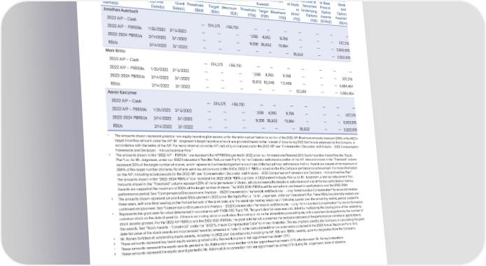 COMPENSATIONTABLES 2022GrantsofPlan-BasedAwardsTable All Other Stock Awards: All Other Grant Number Option DateFair EstimatedFuturePayouts EstimatedFuturePayouts of Awards: Exercise Valueof UnderNon-EquityIncentive UnderEquityIncentivePlan Shares Numberof orBase Stock 1 2 of Stock Securities Priceof and PlanAwards Awards or Underlying Option Option Approval Grant Threshold Target Maximum Threshold Target Maximum 3 Options 4 Units Awards Awards Name(a) Date(b) Date(c) ($)(d) ($)(e) ($)(f) (#)(g) (#)(h) (#)(i) (#)(j) (#)(k) ($/Sh)(l) ($)(m) JonathanAuerbach 2022AIP–Cash — 234,375 468,750 — — — — — — — 2022AIP–PBRSUs 1/25/2022 2/15/2022 — — — 1,098 4,393 8,786 — — — 507,216 2022-2024PBRSUs 2/14/2022 3/1/2022 — — — 9,208 36,832 73,664 — — — 3,922,976 RSUs 2/14/2022 3/1/2022 — — — — — — 36,832 — — 3,922,976 MarkBritto 2022AIP–Cash — 234,375 468,750 — — — — — — — 2022AIP–PBRSUs 1/25/2022 2/15/2022 — — — 1,098 4,393 8,786 — — — 507,216 2022-2024PBRSUs 2/14/2022 3/1/2022 — — — 13,812 55,248 110,496 — — — 5,884,464 RSUs 2/14/2022 3/1/2022 — — — — — — 55,248 — — 5,884,464 AaronKarczmer 2022AIP–Cash — 234,375 468,750 — — — — — — — 2022AIP–PBRSUs 1/25/2022 2/15/2022 — — — 1,098 4,393 8,786 — — — 507,216 2022-2024PBRSUs 2/14/2022 3/1/2022 — — — 9,208 36,832 73,664 — — — 3,922,976 RSUs 2/14/2022 3/1/2022 — — — — — — 36,832 — — 3,922,976 1 Theamountsshownrepresentpotentialnon-equityincentiveplanawardsundertheindividualperformanceportionofthe2022AIP.Maximumamountsrepresent200%oftheNEOs target incentive amountundertheAIP.Mr.Jorgensenstargetincentiveamountwasproratedbasedonthenumberofdaysduring2022thathewasemployedbytheCompany,in accordancewiththetermsoftheAIP.FormoreinformationontheAIP,includingactualpayoutsforthe2022AIP,see“CompensationDiscussionandAnalysis–2022Compensation FrameworkandDecisions–AnnualIncentivePlan.” 2 Theamountsshowninthe“2022AIP–PBRSUs”rowrepresenttheAIPPBRSUsgrantedin2022underourAmendedandRestated2015EquityIncentiveAwardPlan(the“Equity Plan”) or, for Mr. Jorgensen, under our 2022 InducementPlan (the “InducementPlan”),for the Companyperformanceportionof theAIP.Amountsshowninthe“Threshold”column represent25%ofthetargetnumberofshares,whichrepresentsthethresholdperformanceofoneofthetwoprimaryperformancemetrics.Awardsarecappedatthemaximumof 200%ofthetargetnumberofshares.NoshareswereissuedpursuanttotheNEOs2022AIPPBRSUsbasedonthe0%Companyperformanceachievement.Formoreinformation ontheAIP,includingactualpayoutsforthe2022AIP,see“CompensationDiscussionandAnalysis–2022CompensationFrameworkandDecisions–AnnualIncentivePlan.” Theamountsshowninthe“2022-2024PBRSUs”rowrepresentthe2022-2024PBRSUsgrantedin2022undertheEquityPlanor,forMr.Jorgensen,underourInducementPlan. Amountsshowninthe“Threshold”columnrepresent25%ofthetargetnumberofshares,whichrepresentsthethresholdperformanceofoneofthetwoperformancemetrics. Awardsarecappedatthemaximumof200%ofthetargetnumberofshares.The2022-2024PBRSUswillbeearnedandvestbasedonperformanceoverthe2022-2024 performanceperiod.See“CompensationDiscussionandAnalysis–2022CompensationFrameworkandDecisions–Long-TermIncentiveCompensation”formoreinformation. 3 Theamountsshownrepresentservice-basedRSUsgrantedin2022undertheEquityPlanor,forMr.Jorgensen,underourInducementPlan.TheseRSUsbecomefullyvestedover threeyears, with one-thirdvesting on the first anniversary of the grant date, and the remainder vesting ratably each following quarter over the remaining vesting period, subject to continuedemployment.See“CompensationDiscussionandAnalysis–2022CompensationFrameworkandDecisions–Long-TermIncentiveCompensation”formoreinformation. 4 RepresentsthegrantdatefairvaluedeterminedinaccordancewithFASBASCTopic718.Thegrantdatefairvaluewascalculatedbymultiplyingtheclosingpriceoftheunderlying commonstockonthedateofgrant(or,ifthereisnoclosingpriceonsuchdate,theclosingpriceontheimmediatelyprecedingdaywithareportedclosingprice)bythenumberof stockawardsgranted.Forthe2022AIPPBRSUsandthe2022-2024PBRSUs,thegrantdatefairvalueassumestheprobableoutcomeoftheperformanceconditionsapplicableto theawards.See“StockAwards–Column(e)”underthe“2022SummaryCompensationTable”formoreinformation.TheassumptionsusedbytheCompanyincalculatingthegrant datefair value of the stock awards are incorporatedhereinby referenceto Note 15 to the consolidatedfinancialstatementscontainedin the 2022AnnualReportonForm10-K. 5 Mr. Rainey forfeited all outstanding equity awards, includinghis 2022 plan-based awards, includinghis AIP, RSU and PBRSUawards, uponhis resignationfrom the Company. 6 TheseamountsrepresentkeytalentequityawardsgrantedtoMs.RabinovitchpriortoherappointmentasinterimCFO. 7 TheseamountsrepresenttheequityawardsgrantedtoMs.RabinovitchinconnectionwithherappointmentasinterimCFOeffectiveuponMr.Raineysdeparture. 8 TheseamountsrepresenttheequityawardgrantedtoMs.RabinovitchinconnectionwithherappointmentasactingCFOduringMr.Jorgensensleaveofabsence. 74 •2023ProxyStatement