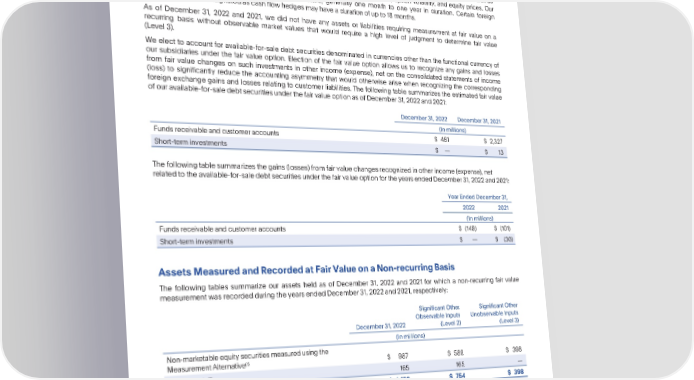 PARTIV Note9—FairValueMeasurementofAssetsandLiabilities PayPalHoldings,Inc. NotestoConsolidatedFinancialStatements—(Continued) Amajorityof our derivativeinstrumentsare valued using pricing models that take into account the contractterms as well as multiple inputs where applicable, such as currency rates, interest rate yield curves, option volatility, and equity prices. Our derivative instruments are primarily short-term in nature, generally one month to one year in duration. Certain foreign currencycontractsdesignatedascashflowhedgesmayhaveadurationofupto18months. As of December 31, 2022 and 2021, we did not have any assets or liabilities requiring measurement at fair value on a recurring basis without observable market values that would require a high level of judgment to determine fair value (Level 3). Weelect to account for available-for-sale debt securities denominated in currencies other than the functional currency of our subsidiaries under the fair value option. Election of the fair value option allows us to recognize any gains and losses from fair value changes on such investments in other income (expense), net on the consolidated statements of income (loss) to significantly reduce the accounting asymmetry that would otherwise arise when recognizing the corresponding foreign exchange gains and losses relating to customer liabilities. The following table summarizes the estimated fair value of our available-for-saledebt securities under the fair value option as of December 31, 2022 and 2021: December31,2022 December31,2021 (In millions) Fundsreceivableandcustomeraccounts $ 481 $ 2,327 Short-terminvestments $— $ 13 Thefollowingtablesummarizesthegains(losses)fromfairvaluechangesrecognizedinotherincome(expense),net related to the available-for-saledebt securities under the fair value option for the years ended December 31, 2022 and 2021: YearEndedDecember31, 2022 2021 (In millions) Fundsreceivableandcustomeraccounts $ (149) $ (101) Short-terminvestments $ — $ (30) AssetsMeasuredandRecordedatFairValueonaNon-recurringBasis The following tables summarize our assets held as of December 31, 2022 and 2021 for which a non-recurring fair value measurementwasrecordedduringtheyearsendedDecember31,2022and2021,respectively: SignificantOther SignificantOther ObservableInputs UnobservableInputs December31,2022 (Level 2) (Level 3) (In millions) Non-marketableequitysecuritiesmeasuredusingthe (1) MeasurementAlternative $ 987 $ 589 $ 398 (2) Otherassets 165 165 — TOTAL $ 1,152 $ 754 $ 398 (1) Excludesnon-marketableequitysecuritiesof$700millionaccountedforundertheMeasurementAlternativeforwhichnoobservablepricechangesoccurredduringtheyearended December31,2022. (2) ConsistsofROUleaseassetsrecordedatfairvaluepursuanttoimpairmentchargesthatoccurredduringtheyearendedDecember31,2022.See“Note6—Leases”foradditional information. 92 •2022AnnualReport