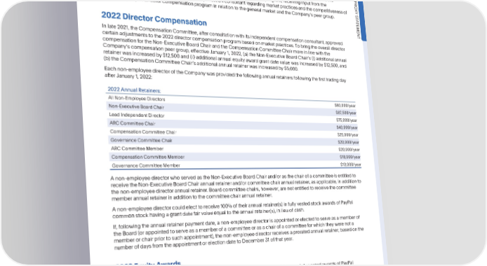 DIRECTORCOMPENSATION Director Compensation TheCompensationCommitteeisresponsibleforreviewingandmakingrecommendationstotheBoardregarding compensationpaidtonon-employeedirectorsfortheirBoardandBoardcommitteeservice.Onanannualbasis,the PRO CompensationCommitteereviewsthenon-employeedirectorcompensationprogram,receivinginputfromthe XY CompensationCommitteesindependentcompensationconsultantregardingmarketpracticesandthecompetitivenessof S T thenon-employeedirectorcompensationprograminrelationtothegeneralmarketandtheCompanyspeergroup. A TEMENT 2022DirectorCompensation In late 2021, the CompensationCommittee,afterconsultationwithitsindependentcompensationconsultant,approved certain adjustmentsto the 2022directorcompensationprogrambasedonmarketpractices.Tobringtheoveralldirector compensationfortheNon-ExecutiveBoardChairandtheCompensationCommitteeChairmoreinlinewiththe Companyscompensationpeergroup,effectiveJanuary1,2022,(a)theNon-ExecutiveBoardChairs(i)additionalannual retainer was increasedby $12,500and(ii) additionalannual equity awardgrantdatevaluewasincreasedby$12,500,and (b) the CompensationCommitteeChairsadditionalannualretainerwasincreasedby$5,000. Eachnon-employeedirectoroftheCompanywasprovidedthefollowingannualretainersfollowingthefirsttradingday after January 1, 2022: 2022AnnualRetainers: All Non-EmployeeDirectors $80,000/year Non-ExecutiveBoardChair $87,500/year LeadIndependentDirector $75,000/year ARCCommitteeChair $40,000/year CompensationCommitteeChair $25,000/year GovernanceCommitteeChair $20,000/year ARCCommitteeMember $20,000/year CompensationCommitteeMember $18,000/year GovernanceCommitteeMember $10,000/year Anon-employeedirectorwhoservedastheNon-ExecutiveBoardChairand/orasthechairofacommitteeisentitledto receivetheNon-ExecutiveBoardChairannualretainerand/orcommitteechairannualretainer,asapplicable,inadditionto thenon-employeedirectorannualretainer.Boardcommitteechairs,however,arenotentitledtoreceivethecommittee memberannualretainerinadditiontothecommitteechairannualretainer. Anon-employeedirectorcouldelecttoreceive100%oftheirannualretainer(s)infullyvestedstockawardsofPayPal commonstockhavingagrantdatefairvalueequaltotheannualretainer(s),inlieuofcash. If, following the annual retainer payment date, a non-employeedirectoris appointedor electedto serve as a memberof theBoard(orappointedtoserveasamemberofacommitteeorasachairofacommitteeforwhichtheywerenota memberorchairpriortosuchappointment),thenon-employeedirectorreceivesaproratedannualretainer,basedonthe numberofdaysfromtheappointmentorelectiondatetoDecember31ofthatyear. 2022EquityAwards In addition to the annual retainers, all non-employee directors received the following fully vested awards of PayPal commonstockfollowingthe2022AnnualMeetingofStockholders. 2022EquityAwards: All Non-EmployeeDirectors $275,000inPayPalcommonstock Non-ExecutiveBoardChair Additional $87,500 in PayPal common stock ThenumberofsharesofPayPalcommonstocksubjecttotheequityawardisdeterminedbydividingthevalueofthe annualequityawardbytheclosingpriceofourcommonstockonthedateoftheannualstockholdersmeeting,roundedup to the nearest whole share. •2023ProxyStatement 35