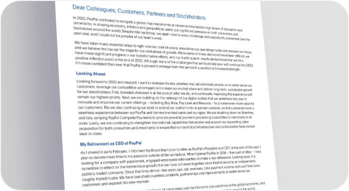 MessagefromOurPresidentandCEO DearColleagues,Customers,PartnersandStockholders: In 2022, PayPal continuedto navigatea global macroeconomicenvironmentmarkedbyhighlevelsofdisruptionand uncertainty.A slowingeconomy,inflationandgeopoliticalunrestputsignificantpressureonbothconsumersand businessesaroundtheworld.Despitethisbackdrop,weagainrosetoeverychallengeandopportunitypresentedoverthe pastyear,andIcouldnotbeprouderofourteamswork. Wehavetakenmanyessentialstepstoright-sizeourcoststructure,streamlineouroperatingmodelandsharpenourfocus, andwebelievethishassetthestageforournextphaseofgrowth.Whilesomeofthesedecisionshavebeendifficult,we havemadesignificantprogressinourtransformationefforts,andourfourthquarterresultsdemonstratethatwehita positive inflection point at the end of 2022. Although many of the challengesthat we faced last year will continue into 2023, Im moreconfidentthaneverthatPayPalispoisedtoemergefromthisperiodinapositionofincreasedstrength. LookingAhead Lookingforwardto2023andbeyond,Iwanttoreiteratethekeyprioritiesthatwillultimatelyenableustobetterserveour customers,leverageourcompetitiveadvantagestoincreaseourmarketshareanddeliverlong-term,sustainablegrowth for our stockholders.First, branded checkout is at the core of what we do, and continually improving this experiencewill remainourhighestpriority.Next,wearebuildingontheredesignofourdigitalwalletsthatweundertooklastyearto innovateandimproveourcurrentofferings–includingBuyNow,PayLaterandRewards–toprovideevenmorevaluefor ourcustomers.Wearealsocontinuingourworktoextendourplatformintoin-personcontexts,sothatcustomershavea seamlessexperiencebetweenourPayPalandVenmobrandedcardsandourapps.WearedoublingdownonBraintree, andfully rampingPayPalCompletePaymentstoprovidepowerfulpaymentprocessingcapabilitiestomerchantsofall sizes. Lastly, we are continuing to strengthen foundational capabilitiesthat enable and support our expanding value propositionfor both consumersandmerchantstoensurethatourtechnicalinfrastructureandcollaborationtoolsremain best-in-class. MyRetirementasCEOofPayPal AsIsharedinearlyFebruary,IinformedtheBoardthatIplantoretireasPayPalsPresidentandCEOattheendofthisyear.I plantodevotemoretimetomypassionsoutsideoftheworkplace.WhenIjoinedPayPalin2014–thenpartofeBay–Iwas looking for a companywithpassionate,engagedemployeeswhowantedtomakearealdifference.Lookingback,itis incredibleto reflect on the tremendousgrowththatwehaveachievedtogethersincePayPalbecameanindependent, publicly traded company.Sincethattimealmostnineyearsago,ourrevenues,totalpaymentvolumeandcashflowhave roughlytripledin size. We have launchedcountlessproducts,partnershipsandimprovementstobetterserveour customersandexpandintonewmarkets. Today,weareempoweringhundredsofmillionsofconsumersandmerchantstojoinandthriveintheglobaleconomy,and werecontributingeverydaytoexpandingeconomicopportunityforcustomersandcommunitiesaroundtheworld. Together,wehaveestablishedPayPalasthegloballeaderindigitalpayments,oneofthemosttrustedbrandsanda companythattrulymakesadifferenceintheworld.Thepastyearandahalfhasnotbeeneasyforouremployeesor shareholdersasweadjustedtoamorechallengingmacroeconomicenvironmentandsignificantgeopoliticaluncertainty. BeforeImadethedecisiontomoveontomynextchapter,IwantedtobesurethatPayPalhadpositivemomentumand waswell-positionedtodeliverastrongyearofperformance.WehavemadeconsiderableprogressandIfullybelievewe havereachedthatpoint.IhavecompletetrustintheBoardtoconductathoroughsearchforthebestpossibleleaderand ensureasmooth,thoughtfultransition–andIlookforwardtocontinuingtoserveontheBoardfollowingthetransition.