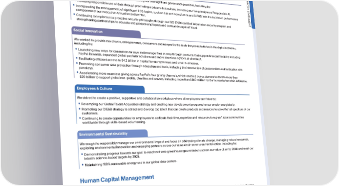 ESGOVERSIGHTANDHIGHLIGHTS ESGStrategy 2022ESGPerformanceHighlights OurannualGlobalImpactReporthighlightsPayPalsprogramsandprogressacrossourfourESGpillars: ResponsibleBusinessPractices PRO XY Wecontinuedtofocusonmaintainingandenhancingouroversightandgovernancepractices,includingby: S T A • Prioritizing responsible use of data through promotinga privacy-firstculture, includingour five principlesof ResponsibleAI. TEMENT • IncorporatingthemanagementofsignificantESGtopics,suchasriskandcomplianceandDIE&B,intotheindividualperformance componentofourexecutiveAnnualIncentivePlan. • ContinuingtoimplementaproactivesecurityphilosophythroughourISO27001certifiedinformationsecurityprogramand strengtheningpartnershipstoeducateandprotectemployeesandconsumersagainstfraud. SocialInnovation Weworkedtoprovidemerchants,entrepreneurs,consumersandnonprofitsthetoolstheyneedtothriveinthedigitaleconomy, includingby: • Launchingnewwaysforconsumerstosaveandmanagetheirmoneythroughproductsthatsupportfinancialflexibilityincluding PayPalRewards,expandedglobalpaylatersolutionsandmoreseamlessoptionsatcheckout. • Facilitating efficient access to $4.2 billion in capital for entrepreneurs and small businesses. • Promotingconsumerdataprotectionthrougheducationandtools,includingtheintroductionofpasswordlessauthenticationwith passkeys. • AcceleratingmoreseamlessgivingacrossPayPalsfourgivingchannels,whichenabledourcustomerstodonatemorethan $20billiontosupportglobalnon-profits,charitiesandcauses,includingmorethan$600millionforthehumanitariancrisisinUkraine. Employees&Culture Westrivedtocreateapositive,supportiveandcollaborativeworkplacewhereallemployeescanthriveby: • RevampingourGlobalTalentAcquisitionstrategyandcreatingnewdevelopmentprogramsforouremployeesglobally. • PromotingourDIE&Bstrategytoattractanddeveloptoptalentthatcancreateproductsandservicestoservethefullspectrumofour customers. • Continuingtocreateopportunitiesforemployeestodedicatetheirtime,expertiseandresourcestosupportlocalcommunities worldwidethroughskills-basedvolunteering. EnvironmentalSustainability Wesoughttoresponsiblymanageourenvironmentalimpactandfocusonaddressingclimatechange,managingnaturalresources, exploringenvironmentalinnovationandengagingpartnersacrossourvaluechainonenvironmentalaction,includingby: • Demonstratingprogresstowardsourgoaltoreachnet-zerogreenhousegasemissionsacrossourvaluechainby2040andmeetour interim science-basedtargetsby2025. • Maintaining100%renewableenergyuseinourglobaldatacenters. HumanCapitalManagement GlobalTalentStrategy PayPalrecognizesthefundamentalimportancetoourbusinessofattracting,recruiting,developingandretainingdiverse talent through a comprehensiveapproachtomanagingourglobaltalent(humancapital)toenableustocreateinnovative productsandservicesforourcustomersandtoserveourstockholdersandotherstakeholders.TheCompensation Committeeoverseesourapproachtoglobaltalent,whichismanagedbyourEVP,PeopleandSourcing.TheBoardand executivemanagementreceiveregularreportsonourapproachandresultswithrespecttoourglobaltalentstrategy. Weremainfocusedonsupportingouremployeesacrossthefullemployeelifecyclefromrecruitment,onboardingand developmenttooffboarding.Wedothisbystrivingtoactivelylistentoourworkforce,broadenourtalentpipeline,promote thephysical,mentalandfinancialwellnessofouremployeesandenableflexibilityandcollaborationinanevolvingwork environment.In2022,webeganintegratingtheLeadershipPrinciplesacrossourglobaltalentstrategytohelpshapeour programsthroughtheemployeelifecycleandachievekeybusinesspriorities. •2023ProxyStatement 41