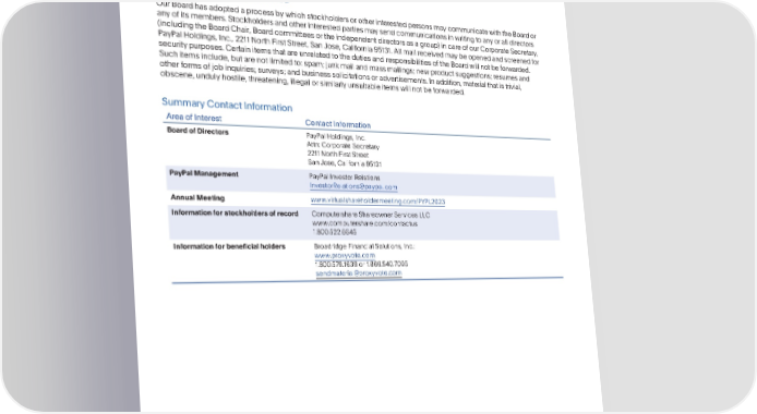FREQUENTLYASKEDQUESTIONS AttendingtheAnnualMeeting CommunicatingwithManagementandInvestorRelations StockholdersmaycontactmanagementorInvestorRelationsthroughourInvestorRelationsdepartmentbywritingto Investor Relations at our principal executive offices at PayPal Holdings, Inc., 2211 North First Street, San Jose, California 95131 or by email at [email protected]. CommunicatingwiththeBoard OurBoardhasadoptedaprocessbywhichstockholdersorotherinterestedpersonsmaycommunicatewiththeBoardor anyofitsmembers.Stockholdersandotherinterestedpartiesmaysendcommunicationsinwritingtoanyoralldirectors (including the Board Chair, Board committeesor the independentdirectorsas a group) in care of our CorporateSecretary, PayPalHoldings,Inc.,2211 NorthFirst Street,San Jose, California 95131. All mail receivedmay be openedand screenedfor security purposes.Certainitemsthatareunrelatedtothedutiesandresponsibilitiesof theBoardwillnotbeforwarded. Suchitemsinclude,butarenotlimitedto:spam;junkmailandmassmailings;newproductsuggestions;resumesand otherformsofjobinquiries;surveys;andbusinesssolicitationsoradvertisements.Inaddition,materialthatistrivial, obscene,undulyhostile,threatening,illegalor similarlyunsuitableitems will not be forwarded. SummaryContactInformation AreaofInterest ContactInformation BoardofDirectors PayPal Holdings, Inc. Attn: Corporate Secretary 2211 North First Street SanJose,California95131 PayPalManagement PayPal Investor Relations [email protected] AnnualMeeting www.virtualshareholdermeeting.com/PYPL2023 Informationforstockholdersofrecord ComputershareShareownerServicesLLC www.computershare.com/contactus 1.800.522.6645 Informationforbeneficialholders BroadridgeFinancialSolutions,Inc.: www.proxyvote.com 1.800.579.1639 or 1.866.540.7095 [email protected] 116 •2023ProxyStatement