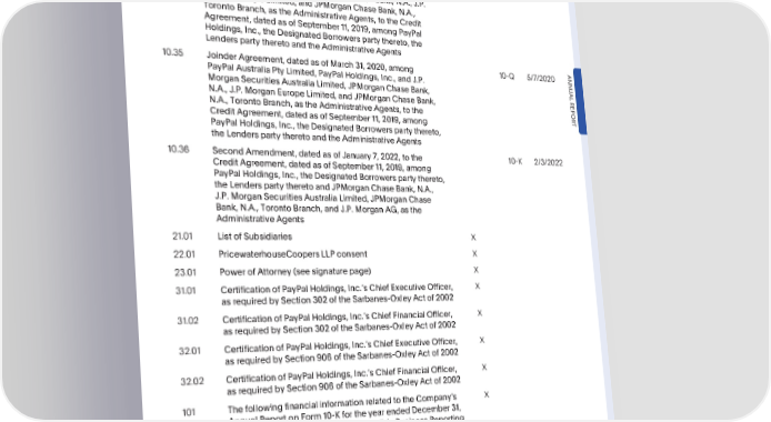 PARTIV IndexofExhibits IncorporatedbyReference Exhibit Filed with this Number Exhibit Description Form10-K Form DateFiled 10.34 JoinderAgreement,datedasofMarch27,2020,among 10-Q 5/7/2020 PayPalPte.Ltd., PayPal Holdings,Inc., and J.P. Morgan Securities Australia Limited, JPMorgan Chase Bank, N.A., J.P. MorganEuropeLimited,andJPMorganChaseBank,N.A., TorontoBranch,astheAdministrativeAgents,totheCredit Agreement,datedasofSeptember11,2019,amongPayPal Holdings,Inc., the DesignatedBorrowerspartythereto,the LenderspartytheretoandtheAdministrativeAgents 10.35 JoinderAgreement,datedasofMarch31,2020,among 10-Q 5/7/2020 ANNU PayPalAustraliaPtyLimited,PayPalHoldings,Inc.,andJ.P. AL MorganSecuritiesAustraliaLimited,JPMorganChaseBank, REPOR N.A., J.P. Morgan Europe Limited, and JPMorganChaseBank, N.A., Toronto Branch, as the AdministrativeAgents, to the CreditAgreement,datedasofSeptember11,2019,among T PayPalHoldings,Inc.,theDesignatedBorrowerspartythereto, theLenderspartytheretoandtheAdministrativeAgents 10.36 SecondAmendment,datedasofJanuary7,2022,tothe 10-K 2/3/2022 CreditAgreement,datedasofSeptember11,2019,among PayPalHoldings,Inc.,theDesignatedBorrowerspartythereto, theLenderspartytheretoandJPMorganChaseBank,N.A., J.P. MorganSecuritiesAustraliaLimited,JPMorganChase Bank,N.A.,TorontoBranch,andJ.P.MorganAG,asthe AdministrativeAgents 21.01 List of Subsidiaries X 22.01 PricewaterhouseCoopersLLPconsent X 23.01 PowerofAttorney(seesignaturepage) X 31.01 Certification of PayPal Holdings, Inc.s Chief Executive Officer, X asrequiredbySection302oftheSarbanes-OxleyActof2002 31.02 Certification of PayPal Holdings, Inc.s Chief Financial Officer, X asrequiredbySection302oftheSarbanes-OxleyActof2002 32.01 Certification of PayPal Holdings, Inc.s Chief Executive Officer, X asrequiredbySection906oftheSarbanes-OxleyActof2002 32.02 Certification of PayPal Holdings, Inc.s Chief Financial Officer, X asrequiredbySection906oftheSarbanes-OxleyActof2002 101 ThefollowingfinancialinformationrelatedtotheCompanys X AnnualReportonForm10-KfortheyearendedDecember31, 2022,formattediniXBRL(InlineExtensibleBusinessReporting Language):(i) the ConsolidatedBalanceSheets,(ii)the ConsolidatedStatementsofIncome(Loss),(iii)the ConsolidatedStatementsofComprehensiveIncome(Loss), (iv) the ConsolidatedStatementsofStockholdersEquity, (v) the ConsolidatedStatementsofCashFlows;and(vi)the related NotestoConsolidatedFinancialStatements 104 CoverPageInteractiveDataFile,formattediniXBRLand X containedinExhibit101 + Indicatesa managementcontractorcompensatoryplanorarrangement •2022AnnualReport 121