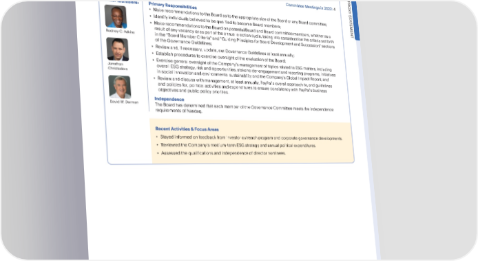 CORPORATEGOVERNANCE BoardCommittees GovernanceCommittee GAILJ.MCGOVERN PRO Chair CommitteeMeetingsin2022:4 XY S T A OtherMembers: PrimaryResponsibilities TEMENT • MakerecommendationstotheBoardastotheappropriatesizeoftheBoardoranyBoardcommittee; • Identify individuals believed to be qualified to become Board members; • MakerecommendationstotheBoardonpotentialBoardandBoardcommitteemembers,whetherasa result of any vacancy or as part of the annual election cycle, taking into consideration the criteria set forth RodneyC.Adkins in the “Board Member Criteria” and “GuidingPrinciples for Board Development and Succession”sections of the GovernanceGuidelines; • Reviewand,ifnecessary,update,ourGovernanceGuidelinesatleastannually; • Establish procedures to exercise oversight of the evaluation of the Board; • Exercise general oversight of the Companys managementof topics related to ESG matters, including Jonathan overall ESG strategy, risk and opportunities, stakeholder engagement and reporting programs, initiatives Christodoro in social innovation and environmental sustainability and the Companys Global Impact Report; and • Reviewanddiscusswithmanagement,atleastannually,PayPalsoverallapproachto,andguidelines andpoliciesfor, political activities and expenditures to ensure consistency with PayPals business objectives and public policy priorities. Independence DavidW.Dorman TheBoardhasdeterminedthateachmemberoftheGovernanceCommitteemeetstheindependence requirementsofNasdaq. RecentActivities&FocusAreas • Stayedinformedonfeedbackfrominvestoroutreachprogramandcorporategovernancedevelopments. • ReviewedtheCompanysmedium-termESGstrategyandannualpoliticalexpenditures. • Assessedthequalificationsandindependenceofdirectornominees. •2023ProxyStatement 25