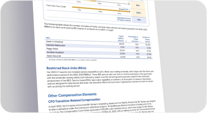 COMPENSATIONDISCUSSIONANDANALYSIS AnnualIncentivePlan PayPalPerformance Threshold Target Maximum Percentage of Measure (50% Payout) (100% Payout) (200% Payout) Target Achieved Actual 16.1% FX-Neutral Revenue CAGR 90% 14.5% 16.5% 17.5% Actual 14.7% Free Cash Flow CAGR 200% 11.0% 13.0% 14.0% Aggregate Percent 145% of Target Achieved ThefollowingtableshowsthenumberofsharesofPayPalcommonstockearnedandvestedpursuanttothe2020-2022 1 PBRSUsforeachparticipatingNEObasedonachievementof145%oftarget. Target Percentageof Numberof PBRSUs Target Shares NEO (Shares) x Achieved = Earned DanielH.Schulman 89,678 145% 130,034 Gabrielle Rabinovitch 9,784 145% 14,188 PeggyAlford 25,623 145% 37,154 JonathanAuerbach 29,893 145% 43,345 AaronKarczmer 32,028 145% 46,441 1 Mr. Rainey forfeited his 2020-2022 PBRSUsin connectionwithhis resignation. RestrictedStockUnits(RSUs) Our2022LTIawardsalsoincludedservice-basedRSUswithathree-yearvestingschedule,whichalignswiththethree-year performanceperiodofthe2022-2024PBRSUs.TheseRSUawardsvestone-thirdonthefirstanniversaryofthegrantdate, with the remaindervestingratablyeachfollowingquarterovertheremainingvestingperiod,subjecttothecontinued employmentoftheNEO.Service-basedRSUshavevalueregardlessofwhetherourstockpriceincreasesordecreases, andaredesignedtohelpsecureandretainourexecutiveofficersandprovideanappropriateincentiveforthemtoremain with us during the vesting period. OtherCompensationElements CFOTransition-RelatedCompensation In April 2022, the CompanyannouncedMr.RaineysimpendingdeparturefromPayPal.Atthattime,Mr.Raineywaseligible to take a sabbatical under the Companyssabbaticalprogram.To facilitatean effectivetransitionof duties prior to his departure,theCompensationCommitteeapproveda$100,000cashtransitionbonus,whichwassubjecttoMr.Rainey remainingcontinuouslyemployedwiththeCompanyuntilMay23,2022,withouttakinganytimeoff.Thetransitionbonus waspayabletoMr.Raineywithintwoandahalfmonthsfollowinghisemploymentterminationdate.Mr.Raineywasnot eligible for any severanceor equity accelerationin connectionwith his departure. In April 2022, the Board appointedMs. Rabinovitchto serveas interim CFO effectiveupon Mr. Raineysdeparture.In June 2022,theCompensationCommitteeapprovedthefollowingretentionpackageforMs.Rabinovitch,giventhepotential retention risks, and her materially expanded duties and responsibilitiesand critical role at the Company: • Aservice-basedRSUawardgrantedonJune15,2022,withagrantdatevalueof$1.5million,subjecttothethree-year vestingscheduleapplicabletoRSUsundertheCompanysLTIprogram. • APBRSUawardgrantedonJune15,2022,withagrantdatetargetvalueof$1.5million,scheduledtovestonMarch1, 2025basedontheCompanysachievementoftheperformanceconditionsforthe2022-2024PBRSUs. 64 •2023ProxyStatement