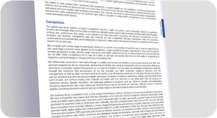 PARTI Item1. Business stolen financial information), and malicious activities by counterparties, represent a significant risk to merchants and consumers, as well as their payment partners. We provide merchants and consumers with protection programs for certain purchase transactions completed on our payments platform. We believe that these programs, which help protect both merchants and consumers from financial loss resulting from fraud and counterparty non-performance, are generally consistent with or broader than protections provided by other participants in the payments industry. Our protection programs are designed to promote confidence on both the part of consumers, who will only be required to pay in certain circumstances,such as receiving their purchased item in the condition significantly as described, and merchants, who will receivepaymentfordeliveringanitemtothecustomer. Our ability to help protect both merchants and consumers is based largely on our proprietary, end-to-end payments platform and our ability to utilize the data from both sides of transactions on our two-sided network, specifically from buyers andsellers and from sendersand receiversof payments.Our ongoing investmentin systemsand processesis designedto enhance the safety and security of our products and reflects our goal of having PayPal recognized as one of the worlds mosttrustedpaymentsbrands. ANNU AL Competition REPOR The global payments industry is highly competitive, dynamic, highly innovative, and increasingly subject to regulatory scrutiny and oversight. Many of the areas in which we compete evolve rapidly with innovative and disruptive technologies, T shifting user preferences and needs, price sensitivity of merchants and consumers, and frequent introductions of new products and services. Competition also may intensify as new competitors emerge, businesses enter into business combinationsandpartnerships,andestablishedcompaniesinothersegmentsexpandtobecomecompetitivewithvarious aspectsofourbusiness. Wecompetewithawiderangeofbusinesses.Someofourcurrentandpotentialcompetitorsareormaybelargerthanwe are, have larger customer bases, greater brand recognition, longer operating histories, a dominant or more secure position, broader geographic scope, volume, scale, resources, and market share than we do, or offer products and services that we do not offer. Other competitors are or may be smaller or younger companies that may be more agile in responding to regulatoryandtechnologicalchangesandcustomerpreferences. Wedifferentiate ourselves to merchants through our ability to innovate and develop products and services that offer new payment experiences for our merchants, demonstrate that they may achieve incremental sales by using and offering our services to consumers, support transactions on our payments platform across varied technologies and payment methods, through the simplicity and transparency of our fee structure, our seller protection programs, analytics, and risk management,aswellasothermerchantservices.Inaddition,wedifferentiateourselvestoconsumersthroughtheabilityto use our products and services across multiple commerce channels, including e-commerce, mobile, and payments at the point of sale, and without sharing their financial information with the merchant or any other party they are paying; our customer service, dispute resolution, and purchase protection programs; and our ability to simplify and personalize shopping experiences. We invest resources towards improving our products and services, offering choice in payment options, providing excellent customerservice,and buildingbrandsthat merchantsandconsumerstrust. Our business faces competition from a wide range of businesses and from all forms of physical and electronic payments. Weface competition from banks and financial institutions, which provide traditional payment methods (particularly credit cardsanddebitcards(collectively,“paymentcards”),electronicbanktransfers,andcredit),paymentnetworksthatfacilitate payments for payment cards or proprietary retail networks, payment card processors, and “card on file” services. We also face competition from providers offering a variety of payment products and services, including tokenized and contactless paymentcards,digital wallets and mobile payments solutions, credit, installment or other buy now pay later methods, real- time payment systems, P2P payments and money remittance services, card readers and other devices or technologies for payment at point of sale, virtual currencies and distributed ledger technologies, and tools that simplify and personalize shopping experiences for consumers and merchants. Our products and services face competition from all forms of payments, which include paper-based payments (primarily cash and checks), credit cards, debit cards, electronic bank transfers, account-to-account payments, credit, installment methods, digital wallets and mobile payment solutions, contactless payments (including contactless cards, tokenized cards, Near Field Communication (NFC) based solutions, andQuickResponse(QR)code-basedsolutions),andvirtualcurrencies,suchascryptocurrenciesandstablecoins. In addition to the discussion in this section, see “Item 1A. Risk Factors” under the caption “We face substantial and increasingly intense competition worldwide in the global payments industry” for further discussion of the potential impact of competitiononourbusiness. •2022AnnualReport 7
