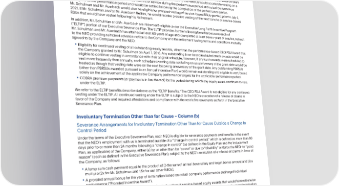 COMPENSATIONTABLES Potential Payments UponTerminationorChangeinControlTable VoluntaryTermination–Column(a) RetirementBenefits Mr. SchulmanandMr.Auerbachareretirement-eligibleundertheirrespective2021-2023PBRSUawardagreements. PursuanttothePBRSUawardagreementprovisions,intheeventtheNEOvoluntarilyresigns,hasattainedatleast60years of age and completedatleastfiveyearsofservice(“Retires”or“Retirement”),thePBRSUswouldacceleratevestingona proratedbasisbasedonthenumberoffullmonthsofserviceduringtheperformanceperiodandactualperformance duringtheentireperformanceperiodandwouldbesettledfollowingthecompletionoftheperformanceperiod. Mr. SchulmanandMr.Auerbachwouldalsobeeligibleforproratedvestingofservice-basedRSUsgrantedpriortoJuly1, 2021. If Mr. Schulman and/or Mr. AuerbachRetires,he would receiveproratedvestingof the next trancheof service-based RSUsthatwouldhavevestedfollowinghisRetirement. In addition, Mr. Schulman and Mr. Auerbachare retirement-eligibleunder the ExecutiveLong Term IncentiveProgram (“ELTIP”) portion of our Executive SeverancePlan. The ELTIP providesfor the following benefits becauseeach of Mr. SchulmanandMr.Auerbachhasattainedatleast60yearsofageandcompletedatleastsevenyearsofservice,subject to the NEOprovidingsufficientadvancenoticetotheCompanyandtheretirementhavingtermsandconditionsmutually agreedtobytheCompanyandtheNEO: • Eligibility for continued vesting of all outstanding equity awards, other than the performance-basedCEO PSU Award that theCompanygrantedtoMr.SchulmanonApril1,2018.Anyoutstandingtime-basedrestrictedstockawardswouldbe eligible to continue vesting in accordancewith their original schedule; however, if any such awards were scheduledto vest morefrequentlythanannually,eachscheduledvestingdatenotfallingonananniversaryofthegrantdatewouldbe treatedasthoughthatvestingdatewereonthenextfollowinganniversaryofthegrantdate.AnyoutstandingPBRSUs (other than PBRSUsawardedpursuanttoanAnnualIncentivePlan)wouldremainoutstandingandeligibletovest,based solely on the achievementof the applicableCompanyperformancetargetsfortheapplicableperformanceperiod. • COBRApremiumpayments(orpaymentsinlieuthereof)fortheperiodduringwhichanyequityawardcontinuestovest undertheELTIP. WerefertotheELTIPbenefitsdescribedaboveasthe“ELTIPBenefits.”TheCEOPSUAwardisnoteligibleforanycontinued vestingundertheELTIP.AllcontinuedvestingundertheELTIPissubjecttotheNEOsexecutionofareleaseofclaimsin favor of the CompanyandrequiredattestationsandcompliancewiththerestrictivecovenantssetforthintheExecutive SeverancePlan. InvoluntaryTerminationOtherthanforCause–Column(b) SeveranceArrangementsforInvoluntaryTerminationOtherThanforCauseOutsideaChangein ControlPeriod UnderthetermsoftheExecutiveSeverancePlan,eachNEOiseligibleforseverancepaymentsandbenefitsintheevent that the NEOs employmentwithusisterminatedoutsideofa“changeincontrolperiod,”whichisdefinedasmorethan90 dayspriortoormorethan24monthsfollowinga“changeincontrol”(asdefinedintheEquityPlanandtheInducement Plan, as applicable) of the Company, either (a) by us other than for “cause” or due to “disability” or (b) by the NEO for “good reason”(eachasdefinedintheExecutiveSeverancePlan),subjecttotheNEOsexecutionofareleaseofclaimsinfavorof theCompany,asfollows: • Alumpsumcashpaymentequaltotheproductof(i)thesumofannualbasesalaryandtargetbonusamountand(ii)a multiple (2x for Mr. Schulman and 1.5x for our other NEOs). • Aproratedannualbonusfortheyearofterminationbasedonactualcompanyperformanceandtargetindividual performance(“ProratedIncentiveAward”). • For awardsgrantedpriortoJuly1,2021:acceleratedvestingofservice-basedequityawardsthatwouldhaveotherwise becomevestedpursuanttotheirordinaryvestingschedulewithinthe12monthsfollowingtheemploymenttermination date; performance-basedequityawardssubjecttoaperformanceperiodthatendswithinthe12monthsfollowingthe employmentterminationdatewouldremainoutstandingandeligibletovest,basedsolelyontheachievementofthe Companyperformancetargets.ForawardsgrantedonorafterJuly1,2021:eligibilitytocontinuetovestinservice- basedandperformance-basedequityawardsscheduledtovestwithinthe12monthsfollowingtheemployment terminationdate,subjecttotheNEOsexecutionofareleaseofclaimsinfavoroftheCompanyandrequired attestationsand compliancewiththerestrictivecovenantssetforthintheExecutiveSeverancePlan. • If the NEO is employedby the CompanyintheU.S.,participatesin theCompanyshealthinsuranceprogramandis eligible to continue to participate in the program under COBRA, the Company will provide COBRApremiumpayments for 18 months for Mr. Schulman and 12 months for our other NEOs. 78 •2023ProxyStatement