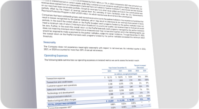 PARTII Item7. ManagementsDiscussionandAnalysisofFinancialConditionandResultsofOperations Transaction revenues grew more slowly than TPV and the number of payment transactions in 2022 due primarily to declines in foreign currency exchange fees, TPV attributable to eBays marketplace (where we had historically earned higher rates), and a decline in revenues from core PayPal products and services, partially offset by a favorable impact from hedgingandanincreaseinrevenuefromourVenmoproductsandservices. RevenuesFromOtherValueAddedServices Revenuesfromothervalueaddedservicesincreasedby$343million,or17%,in2022comparedto2021dueprimarilytoan increase in interest earned on certain assets underlying customer account balances resulting from higher interest rates, our revenueshareearnedfromanindependentcharteredfinancialinstitution(“partnerinstitution”),andinterestandfeerevenue on our merchant loans receivable portfolio. Growth in revenues from other value added services in the current period was partially offset by the impact of revenue earned from the servicing of loans facilitated under the U.S. Governments PaycheckProtectionProgramin2021of$157million,forwhichrevenuewasdeminimisinthecurrentperiod. Consumersthathaveoutstandingloansandinterestreceivableduetothepartnerinstitutionmayexperiencehardshipsthat result in losses recognized by the partner institution, which may result in a decrease in our revenue share earned in future periods. In the event the overall return on the PayPal branded credit programs funded by the partner institution does not meetaminimumrateofreturn(“minimumreturnthreshold”)in a particularquarter, our revenue share for that period would be zero. Further, in the event the overall return on the PayPal branded credit programs managed by the partner institution does not meet the minimum return threshold as measured over four consecutive quarters and in the following quarter, we would be required to make a payment to the partner institution, subject to certain limitations. Through December 31, 2022, the overall return on the PayPal branded credit programs funded by the partner institution exceeded the minimum return threshold. Seasonality The Company does not experience meaningful seasonality with respect to net revenues. No individual quarter in 2022, 2021, or 2020 accountedfor morethan30%ofannualnetrevenue. OperatingExpenses Thefollowingtablesummarizesouroperatingexpensesandrelatedmetricsweusetoassessthetrendsineach: PercentIncrease/ YearEndedDecember31, (Decrease) 2022 2021 2020 2022 2021 (In millions, except percentages) Transactionexpense $ 12,173 $ 10,315 $ 7,934 18% 30% Transactionandcreditlosses 1,572 1,060 1,741 48% (39)% Customersupportandoperations 2,120 2,075 1,778 2% 17% Salesandmarketing 2,257 2,445 1,861 (8)% 31% Technologyanddevelopment 3,253 3,038 2,642 7% 15% Generalandadministrative 2,099 2,114 2,070 (1)% 2% Restructuringandothercharges 207 62 139 234% (55)% TOTALOPERATINGEXPENSES $ 23,681 $ 21,109 $ 18,165 12% 16% (1) 0.90% 0.83% 0.85% ** ** Transactionexpenserate (2) Transactionandcreditlossrate 0.12% 0.09% 0.19% ** ** (1) TransactionexpenserateiscalculatedbydividingtransactionexpensebyTPV. (2) TransactionandcreditlossrateiscalculatedbydividingtransactionandcreditlossesbyTPV. ** Notmeaningful. TransactionExpense Transactionexpenseisprimarilycomposedofthecostsweincurtoacceptacustomersfundingsourceofpayment.These costs include fees paid to payment processors and other financial institutions when we draw funds from a customers credit or debit card, bank account, or other funding source they have stored in their digital wallet. We refer to the allocation of funding sources used by our consumers as our “funding mix.” The cost of funding a transaction with a credit or debit card is generally higher than the cost of funding a transaction from a bank or through internal sources such as a PayPal or 36 •2022AnnualReport