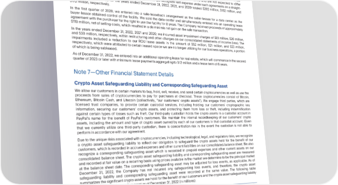 PARTIV Note6—Leases PayPalHoldings,Inc. NotestoConsolidatedFinancialStatements—(Continued) Operating lease amounts include minimum lease payments under our non-cancelable operating leases primarily for office and data center facilities. The amounts presented are consistent with contractual terms and are not expected to differ significantly from actual results under our existing leases. We recognize rent expense under such agreements on a straight- line basis. Rent expense for the years ended December 31, 2022, 2021, and 2020 totaled $202 million, $192 million, and $172million, respectively. In the first quarter of 2020, we entered into a sale-leaseback arrangement as the seller-lessee for a data center as the buyer-lessor obtained control of the facility. We sold the data center and simultaneously entered into an operating lease agreementwiththepurchaserfortherightto usethefacilityfor 8 years.The Companyreceivedproceedsof approximately $119 million, net of selling costs, which resulted in a de minimis net gain on the sale transaction. In the years ended December 31, 2022, 2021 and 2020, we incurred asset impairment charges of $81 million, $26 million, and $30 million, respectively, within restructuring and other charges on our consolidated statements of income (loss). The impairments included a reduction to our ROU lease assets in the amount of $52 million, $21 million, and $23 million, respectively, which were attributed to certain leased space we are no longer utilizing for our business operations, a portion of whichis beingsubleased. AsofDecember31,2022,weenteredintoanadditionaloperatingleaseforrealestate,whichwillcommenceinthesecond quarter of 2023 or later with minimum lease paymentsaggregatingto $12 million and a lease term of 6 years. Note7—OtherFinancialStatementDetails CryptoAssetSafeguardingLiabilityandCorrespondingSafeguardingAsset Weallowourcustomersin certain markets to buy, hold, sell, receive, and send certain cryptocurrencies as well as use the proceeds from sales of cryptocurrencies to pay for purchases at checkout. These cryptocurrencies consist of Bitcoin, Ethereum, Bitcoin Cash, and Litecoin (collectively, “our customers crypto assets”). We engage third parties, which are licensed trust companies, to provide certain custodial services, including holding our customers cryptographic key information, securing our customers crypto assets, and protecting them from loss or theft, including indemnification against certain types of losses such as theft. Our third-party custodian holds the crypto assets in a custodial account in PayPals name for the benefit of PayPals customers. We maintain the internal recordkeeping of our customers crypto assets, including the amount and type of crypto asset owned by each of our customers in that custodial account. Given that we currently utilize one third-party custodian, there is concentration risk in the event the custodian is not able to performinaccordancewithouragreement. Duetotheuniquerisksassociatedwithcryptocurrencies,includingtechnological,legal, and regulatory risks, we recognize a crypto asset safeguarding liability to reflect our obligation to safeguard the crypto assets held for the benefit of our customers,whichis recordedin accruedexpensesandothercurrentliabilitieson our consolidatedbalancesheet.We also recognize a corresponding safeguarding asset which is recorded in prepaid expenses and other current assets on our consolidated balance sheet. The crypto asset safeguarding liability and corresponding safeguarding asset are measured andrecordedatfair value on a recurring basis using prices available in the market we determine to be the principal market at the balance sheet date. The corresponding safeguarding asset may be adjusted for loss events, as applicable. As of December 31, 2022, the Company has not incurred any safeguarding loss events, and therefore, the crypto asset safeguarding liability and corresponding safeguarding asset were recorded at the same value. The following table summarizesthesignificantcryptoassetsweholdforthebenefitofourcustomersandthecryptoassetsafeguardingliability andcorrespondingsafeguardingassetasofDecember31,2022(inmillions): Bitcoin $ 291 Ethereum 250 Other 63 CRYPTOASSETSAFEGUARDINGLIABILITY $ 604 CRYPTOASSETSAFEGUARDINGASSET $ 604 80 •2022AnnualReport