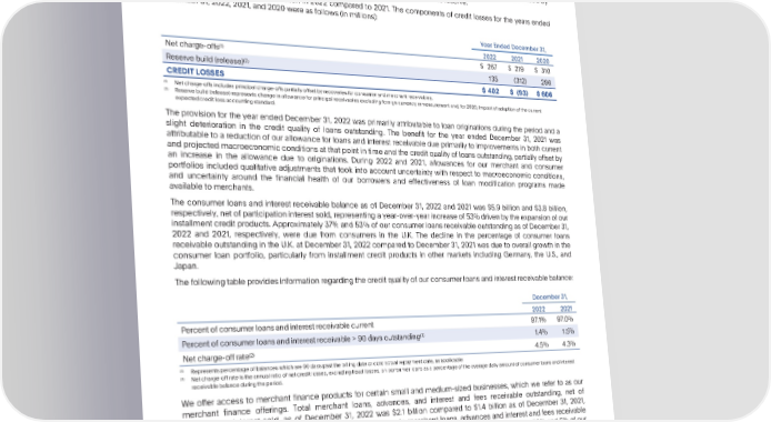 PARTII Item7. ManagementsDiscussionandAnalysisofFinancialConditionandResultsofOperations related to our Venmo products and services resulting from fraud schemes, an increase in goods and services transactions which are now eligible for coverage by our protection programs, and a loss related to a merchant insolvency proceeding, which was offset by recoveries attributable to enhancements in our fraud recoupment capabilities and benefits from continued risk mitigation strategies. In the second quarter of 2022, we recorded a $114 million estimated loss related to the above mentioned merchant insolvency proceeding, and in the fourth quarter of 2022, this estimated loss was reduced by approximately$75milliontoaccountforrecoveriesandchangesinourestimatedlossreserve. Credit losses increased by $495 million in 2022 compared to 2021. The components of credit losses for the years ended December31,2022,2021,and2020wereasfollows(inmillions): YearEndedDecember31, 2022 2021 2020 (1) Netcharge-offs $ 267 $ 219 $ 310 (2) Reservebuild(release) 135 (312) 296 CREDITLOSSES $ 402 $ (93) $606 (1) Netcharge-offsincludesprincipalcharge-offspartiallyoffset by recoveriesfor consumerandmerchantreceivables. (2) Reservebuild(release)representschangeinallowanceforprincipalreceivablesexcludingforeigncurrencyremeasurementand,for2020,impactofadoptionofthecurrent expectedcreditlossaccountingstandard. The provision for the year ended December 31, 2022 was primarily attributable to loan originations during the period and a slight deterioration in the credit quality of loans outstanding. The benefit for the year ended December 31, 2021 was attributable to a reduction of our allowance for loans and interest receivable due primarily to improvements in both current andprojectedmacroeconomicconditionsatthatpointintimeandthecreditqualityofloansoutstanding,partiallyoffsetby an increase in the allowance due to originations. During 2022 and 2021, allowances for our merchant and consumer portfolios included qualitative adjustments that took into account uncertainty with respect to macroeconomic conditions, and uncertainty around the financial health of our borrowers and effectiveness of loan modification programs made available to merchants. The consumer loans and interest receivable balance as of December 31, 2022 and 2021 was $5.9 billion and $3.8 billion, respectively,net of participation interest sold, representing a year-over-year increase of 53% driven by the expansion of our installment credit products. Approximately 37% and 53% of our consumer loans receivableoutstandingas of December31, 2022 and 2021, respectively, were due from consumers in the U.K. The decline in the percentage of consumer loans receivable outstanding in the U.K. at December 31, 2022 compared to December 31, 2021 was due to overall growth in the consumer loan portfolio, particularly from installment credit products in other markets including Germany, the U.S., and Japan. Thefollowingtableprovidesinformationregardingthecreditqualityofourconsumerloansandinterestreceivablebalance: December31, 2022 2021 Percentofconsumerloansandinterestreceivablecurrent 97.1% 97.0% (1) Percentofconsumerloansandinterestreceivable>90daysoutstanding 1.4% 1.5% (2) Netcharge-offrate 4.5% 4.3% (1) Representspercentageofbalanceswhichare90dayspastthebillingdateorcontractualrepaymentdate,asapplicable. (2) Netcharge-offrateistheannualratioofnetcreditlosses,excludingfraudlosses,onconsumerloansasapercentageoftheaveragedailyamountofconsumerloansandinterest receivablebalanceduringtheperiod. Weoffer access to merchant finance products for certain small and medium-sized businesses, which we refer to as our merchant finance offerings. Total merchant loans, advances, and interest and fees receivable outstanding, net of participation interest sold, as of December 31, 2022 was $2.1 billion compared to $1.4 billion as of December 31, 2021, representing a year-over-year increase of 48%. The increase in merchant loans, advances and interest and fees receivable outstandingwasdueprimarilytogrowthinourPayPalBusinessLoanproductsintheU.S.Approximately86%and5%ofour merchantreceivablesoutstanding as of December 31, 2022 were due from merchants in the U.S. and U.K., as compared to approximately82%and8%asofDecember31,2021,respectively. 38 •2022AnnualReport