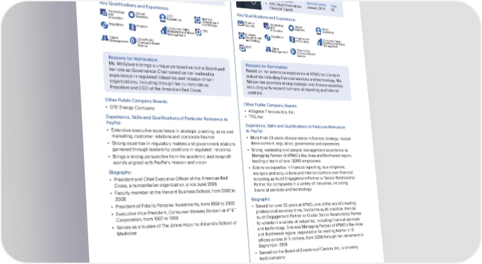 PROPOSAL1:ELECTIONOFDIRECTORS Director Biographies GAILJ.MCGOVERN DEBORAHM.MESSEMER President and Chief Executive Officer of the FormerMajorMarketManagingPartner AmericanRedCross at KPMG INDEPENDENT INDEPENDENT BoardCommittees: Directorsince: Age: BoardCommittees: Directorsince: Age: • Compensation June2015 71 • ARC(AuditCommittee January 2019 65 • Governance(Chair) Financial Expert) KeyQualificationsandExperience: KeyQualificationsandExperience: Technology Global CEO Business Financial Technology Global Senior and Business Experience Development Services and Business Leadership Innovation and Strategy Innovation Regulatory Finance Consumer, Sales, ESG Business Regulatory Finance and Consumer, Sales, Marketing and Brand Development Accounting Marketing and Brand Management and Strategy Management Talent Other Public ESG Talent Other Public Management Company Board Management Company Board Service Service ReasonsforNomination: ReasonsforNomination: Ms.McGovernbringsauniqueperspectivetotheBoardand BasedonherextensiveexperienceatKPMGforclientsin her role as Governance Chair based on her leadership industries including financial services and technology, Ms. experienceinregulatedindustriesandmission-driven Messemerprovidesstrongstrategicandfinanceexpertise, organizations, including through her current role as includingwithrespecttofinancialreportingandinternal President and CEOoftheAmericanRedCross. controls. OtherPublicCompanyBoards: OtherPublicCompanyBoards: • DTEEnergyCompany • AllogeneTherapeutics,Inc. Experience,SkillsandQualificationsofParticularRelevanceto • TPG,Inc PayPal: Experience,SkillsandQualificationsofParticularRelevance • Extensiveexecutiveexperienceinstrategicplanning,sales and to PayPal: marketing, customer relations and corporate finance • Morethan30yearsofexperienceinfinance,strategy,market • Strongexpertiseinregulatorymatters andgovernmentrelations development,regulation,governanceandoperations garneredthroughleadershippositionsinregulatedindustries • Strongleadershipandpeoplemanagementexperienceas • Brings a strong perspective from the academic and nonprofit ManagingPartnerofKPMGsBayAreaandNorthwestregion, worldsalignedwithPayPalsmissionandvision leading a team of over 3,000 employees Biography: • Extensiveexpertise in financial reporting, due diligence, mergersandacquisitionsandinternalcontrolsoverfinancial • President and Chief Executive Officer of the American Red reporting as Audit EngagementPartner or Senior Relationship Cross, a humanitarianorganization, since June 2008 Partner for companies in a variety of industries, including • Faculty memberattheHarvardBusinessSchool,from2002to financial services and technology 2008 Biography: • President of Fidelity Personal Investments, from 1998 to 2002 • Servedforover35yearsatKPMG,oneoftheworldsleading • ExecutiveVicePresident,ConsumerMarketsDivisionatAT&T professional services firms, first in the audit practice, then as Corporation, from 1997 to 1998 Audit EngagementPartnerorGlobalSeniorRelationshipPartner • ServesasatrusteeofTheJohnsHopkinsUniversitySchoolof for clients in a variety of industries, including financial services Medicine andtechnology.ShewasManagingPartnerofKPMGsBayArea andNorthwestregion,responsibleforleadingteamsin10 offices across all functions, from 2008 through her retirement in September2018 • ServedontheBoardofDirectorsofCarbon,Inc.,aprivately heldcompany 18 •2023ProxyStatement
