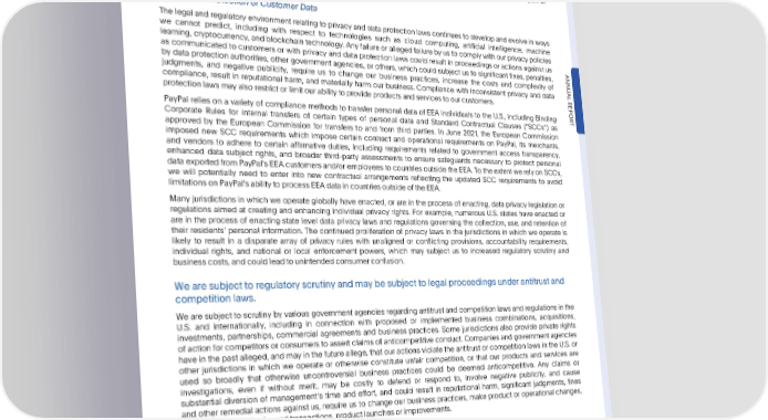 PARTI Item1A.RiskFactors to comply with economic and trade sanctions administered by the U.S., the EU and its member states, the U.K., and other jurisdictions in which we operate. Non-compliance with anti-money laundering laws and regulations or economic and trade sanctions may subject us to significant fines, penalties, lawsuits, and enforcement actions, result in regulatory sanctionsandadditionalcompliancerequirements,increaseregulatoryscrutinyof our business,restrictour operations,and damage our reputation and brands. Our compliance history may be considered by OFAC and other regulators as part of anypotentialfutureinvestigationof our sanctionsregulation. PrivacyandProtectionofCustomerData Thelegal and regulatory environment relating to privacy and data protection laws continues to develop and evolve in ways we cannot predict, including with respect to technologies such as cloud computing, artificial intelligence, machine learning, cryptocurrency,and blockchaintechnology.Any failure or alleged failure by us to comply with our privacy policies as communicatedto customers or with privacy and data protection laws could result in proceedings or actions against us by data protection authorities, other government agencies, or others, which could subject us to significant fines, penalties, ANNU judgments, and negative publicity, require us to change our business practices, increase the costs and complexity of compliance, result in reputational harm, and materially harm our business. Compliance with inconsistent privacy and data AL protectionlawsmayalsorestrictorlimitourabilitytoprovideproductsandservicestoourcustomers. REPOR PayPal relies on a variety of compliance methods to transfer personal data of EEA individuals to the U.S., including Binding Corporate Rules for internal transfers of certain types of personal data and Standard Contractual Clauses (“SCCs”) as T approved by the European Commission for transfers to and from third parties. In June 2021, the European Commission imposed new SCC requirements which impose certain contract and operational requirements on PayPal, its merchants, and vendors to adhere to certain affirmative duties, including requirements related to government access transparency, enhanced data subject rights, and broader third-party assessments to ensure safeguards necessary to protect personal dataexportedfromPayPalsEEAcustomersand/oremployeestocountriesoutsidetheEEA.TotheextentwerelyonSCCs, we will potentially need to enter into new contractual arrangements reflecting the updated SCC requirements to avoid limitations on PayPals ability to process EEA data in countries outside of the EEA. Manyjurisdictions in which we operate globally have enacted, or are in the process of enacting, data privacy legislation or regulations aimed at creating and enhancing individual privacy rights. For example, numerous U.S. states have enacted or are in the process of enacting state level data privacy laws and regulations governing the collection, use, and retention of their residents personal information. The continued proliferation of privacy laws in the jurisdictions in which we operate is likely to result in a disparate array of privacy rules with unaligned or conflicting provisions, accountability requirements, individual rights, and national or local enforcement powers, which may subject us to increased regulatory scrutiny and businesscosts,andcouldleadtounintendedconsumerconfusion. Wearesubjecttoregulatoryscrutinyandmaybesubjecttolegalproceedingsunderantitrustand competitionlaws. Wearesubjecttoscrutinyby various governmentagenciesregardingantitrust and competitionlaws and regulations in the U.S. and internationally, including in connection with proposed or implemented business combinations, acquisitions, investments, partnerships, commercial agreements and business practices. Some jurisdictions also provide private rights of action for competitors or consumers to assert claims of anticompetitive conduct. Companies and government agencies havein the past alleged, and may in the future allege, that our actions violate the antitrust or competition laws in the U.S. or other jurisdictions in which we operate or otherwise constitute unfair competition, or that our products and services are used so broadly that otherwise uncontroversial business practices could be deemed anticompetitive. Any claims or investigations, even if without merit, may be costly to defend or respond to, involve negative publicity, and cause substantial diversion of managements time and effort, and could result in reputational harm, significant judgments, fines and other remedial actions against us, require us to change our business practices, make product or operational changes, or delay or precludeplannedtransactions,productlaunchesorimprovements. Weareregularlysubjecttogenerallitigation,regulatoryscrutiny,andgovernmentinquiries. Weareregularlysubjectto claims, individual and class action lawsuits, arbitration proceedings, government and regulatory investigations, inquiries, actions or requests, and other proceedings alleging violations of laws, rules, and regulations with respectto competition, antitrust, intellectual property, privacy, data protection, information security, anti-money laundering, counter-terrorist financing, sanctions, anti-bribery, anti-corruption, consumer protection (including unfair, deceptive, or abusive acts or practices), fraud, accessibility, securities, tax, labor and employment, commercial disputes, services, charitable fundraising, contract disputes, escheatment of unclaimed or abandoned property, product liability, use of our services for illegal purposes, the matters described in “Note 13—Commitments and Contingencies—Litigation and Regulatory Matters—General Matters” to our consolidated financial statements, and other matters. The number and •2022AnnualReport 19