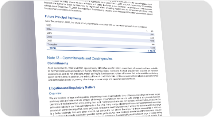 PARTIV Note12—Debt PayPalHoldings,Inc. NotestoConsolidatedFinancialStatements—(Continued) OtherAvailableFacilities Wealsomaintain uncommitted credit facilities in various regions throughout the world, which had a borrowing capacity of approximately $80 million and $90 million in the aggregate, as of December 31, 2022 and 2021, respectively. This available credit includes facilities where we can withdraw and utilize the funds at our discretion for general corporate purposes. Interest rate terms for these facilities vary by region and reflect prevailing market rates for companies with strong credit ratings. As of December 31, 2022, the majority of the borrowing capacity under these credit facilities was available, subject to customaryconditionstoborrowing. FuturePrincipalPayments AsofDecember31,2022,thefutureprincipalpaymentsassociatedwithourtermdebtwereasfollows(inmillions): 2023 $ 418 2024 1,250 2025 1,000 2026 1,250 2027 500 Thereafter 6,000 TOTAL $ 10,418 Note13—CommitmentsandContingencies Commitments As of December 31, 2022 and 2021, approximately $4.9 billion and $4.1 billion, respectively, of unused credit was available to PayPal Credit account holders in the U.K. While this amount represents the total unused credit available, we have not experienced,and do not anticipate, that all our PayPal Credit account holders will access their entire available credit at any given point in time. In addition, the individual lines of credit that make up this unused credit are subject to periodic review andterminationbasedon,amongotherthings,accountusageandcustomercreditworthiness. LitigationandRegulatoryMatters Overview Weareinvolved in legal and regulatory proceedings on an ongoing basis. Many of these proceedings are in early stages and may seek an indeterminate amount of damages or penalties or may require us to change or adopt certain business practices. If we believe that a loss arising from such matters is probable and can be reasonably estimated, we accrue the estimatedliability in our financial statements at that time. If only a range of estimated losses can be determined, we accrue anamountwithintherangethat,inourjudgment,reflectsthemostlikelyoutcome;ifnoneoftheestimateswithinthatrange is a better estimate than any other amount, we accrue the low end of the range. For those proceedings in which an unfavorable outcome is reasonably possible but not probable, we have disclosed an estimate of the reasonably possible loss or range of losses or we have concluded that an estimate of the reasonably possible loss or range of losses arising directly from the proceeding (i.e., monetary damages or amounts paid in judgment or settlement) are not material. If we cannot estimate the probable or reasonably possible loss or range of losses arising from a legal proceeding, we have disclosed that fact. In assessing the materiality of a legal proceeding, we evaluate, among other factors, the amount of monetary damagesclaimed,as well as the potential impact of non-monetary remedies sought by plaintiffs (e.g., injunctive relief) that may require us to change our business practices in a manner that could have a material adverse impact on our business. With respect to the matters disclosed in this Note 13, we are unable to estimate the possible loss or range of lossesthatcouldpotentiallyresultfromtheapplicationof suchnon-monetaryremedies. Amounts accrued for legal and regulatory proceedings for which we believe a loss is probable and reasonably estimable werenot material for the year ended December 31, 2022. Except as otherwise noted for the proceedings described in this Note13, we have concluded,basedon currentlyavailable information, that reasonably possible losses arising directly from 104 •2022AnnualReport