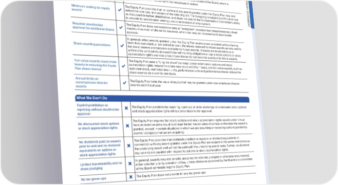 PROPOSAL3:VOTETOAPPROVEPAYPALHOLDINGS,INC.2015EQUITYINCENTIVEAWARDPLAN,ASAMENDEDANDRESTATED Increasing the NumberofSharesReservedforIssuanceundertheEquityPlan TheEquityPlanIncorporatesGoodCompensationandGovernancePracticesDesignedtoProtect StockholderInterests WhatWeDo Administeredby100% PRO independentCompensation TheEquityPlanisadministeredbytheCompensationCommitteeoftheBoard,whichis XY Committee comprisedentirelyofindependentnon-employeedirectors. S T A TheEquityPlanprovidesthatnoportionofanyawardgrantedundertheEquityPlanmayvest TEMENT Minimumvestingforequity before the one-year anniversary of the date of grant. The foregoing is subject to a 5% carve-out, awards asdiscussedinfurtherdetailbelow,anddoesnotrestricttheCompensationCommitteesability to provide for accelerated vesting upon a termination of employment. Requiredstockholder TheEquityPlandoesnotcontainanannual“evergreen”provisionbutinsteadreservesafixed approvalforadditionalshares maximumnumberofsharesforissuance,whichcanonlybeincreasedwithstockholder approval. In general, when awards granted under the Equity Plan expire or are canceled without having beenfullyexercised, or are settled in cash, the shares reserved for those awards are returned to Sharecountingprovisions the share reserve and become available for future awards. If shares are tendered to us or withheldbyustosatisfyanawardstaxwithholdingobligationsorpayastockoptionsorstock appreciation rights exercise price, those shares do not become available for future awards. Full-value awardscountmore TheEquityPlanusesa“fungibleshare”concept,underwhichstockoptionsandstock heavily in reducingthe Equity appreciation rights reduce the share reserve on a 0.5 for 1 basis, and full-value awards, such as Plansharereserve restricted stock, restricted stock units, performance units and performance shares reduce the share reserve on a one for one basis. Annuallimitson TheEquityPlanlimitsthevalueofequitythatmaybegrantedundernon-employeedirector nonemployeedirector awardseachfiscalyear. awards WhatWeDontDo Explicit prohibitionon TheEquityPlanprohibitstherepricing,cash-outorotherexchangeofunderwaterstockoptions repricingwithoutstockholder andstockappreciationrightswithoutpriorstockholderapproval. approval Nodiscountedstockoptions TheEquityPlanrequiresthatstockoptionsandstockappreciationrightsissuedunderitmust or stock appreciationrights haveanexercisepriceequaltoatleastthefairmarketvalueofashareonthedatetheawardis granted, except in certain situations in which we are assuming or replacing options granted by anothercompanythatweareacquiring. Nodividendspaidonawards TheEquityPlanprovidesthatdividendscreditedorpayableordividendequivalentsin prior to vest and no dividend connectionwithanyawardgrantedundertheEquityPlanaresubjecttothesamerestrictionsas equivalentsonoptionsor the underlyingawardandwillnotbepaiduntiltheunderlyingawardvests.Further,nodividend stockappreciationrights equivalents are payable with respect to options or stock appreciation rights. Limitedtransferabilityand no In general, awards may not be sold, assigned, transferred, pledged or otherwise encumbered, sharepledging either voluntarily or by operation of law, unless otherwise approved by the Board or a committee of the Board administering the Equity Plan. Notaxgross-ups TheEquityPlandoesnotprovideforanytaxgross-ups. •2023ProxyStatement 87