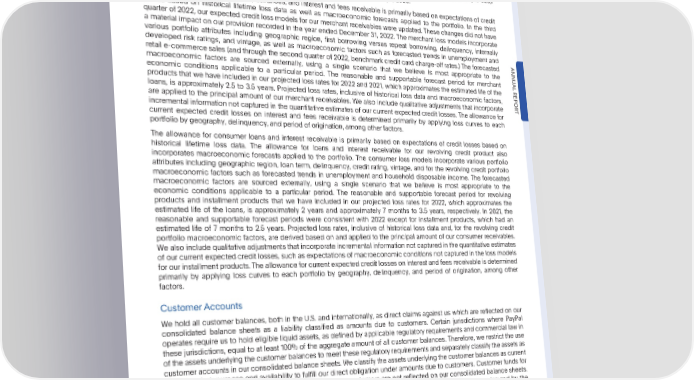 PARTIV Note1—OverviewandSummaryofSignificantAccountingPolicies PayPalHoldings,Inc. NotestoConsolidatedFinancialStatements—(Continued) The Company adopted Accounting Standards Update (“ASU”) 2016-13, Financial Instruments—Credit Losses (Topic 326): MeasurementofCreditLossesonFinancialInstruments(“CECL”)effectiveJanuary1,2020. The allowance for merchant loans, advances, and interest and fees receivable is primarily based on expectations of credit losses based on historical lifetime loss data as well as macroeconomic forecasts applied to the portfolio. In the third quarter of 2022, our expected credit loss models for our merchant receivables were updated. These changes did not have a material impact on our provision recorded in the year ended December 31, 2022. The merchant loss models incorporate various portfolio attributes including geographic region, first borrowing versus repeat borrowing, delinquency, internally developed risk ratings, and vintage, as well as macroeconomic factors such as forecasted trends in unemployment and retail e-commerce sales (and through the second quarter of 2022, benchmark credit card charge-off rates.) The forecasted ANNU macroeconomic factors are sourced externally, using a single scenario that we believe is most appropriate to the economic conditions applicable to a particular period. The reasonable and supportable forecast period for merchant AL products that we have included in our projected loss rates for 2022 and 2021, which approximates the estimated life of the REPOR loans, is approximately 2.5 to 3.5 years. Projected loss rates, inclusive of historical loss data and macroeconomic factors, are applied to the principal amount of our merchant receivables. We also include qualitative adjustments that incorporate T incremental information not captured in the quantitative estimates of our current expected credit losses. The allowance for current expected credit losses on interest and fees receivable is determined primarily by applying loss curves to each portfolio by geography,delinquency,andperiodoforigination,amongotherfactors. The allowance for consumer loans and interest receivable is primarily based on expectations of credit losses based on historical lifetime loss data. The allowance for loans and interest receivable for our revolving credit product also incorporates macroeconomic forecasts applied to the portfolio. The consumer loss models incorporate various portfolio attributes including geographic region, loan term, delinquency, credit rating, vintage, and for the revolving credit portfolio macroeconomic factors such as forecasted trends in unemployment and household disposable income. The forecasted macroeconomic factors are sourced externally, using a single scenario that we believe is most appropriate to the economic conditions applicable to a particular period. The reasonable and supportable forecast period for revolving products and installment products that we have included in our projected loss rates for 2022, which approximates the estimated life of the loans, is approximately 2 years and approximately 7 months to 3.5 years, respectively. In 2021, the reasonable and supportable forecast periods were consistent with 2022 except for installment products, which had an estimated life of 7 months to 2.5 years. Projected loss rates, inclusive of historical loss data and, for the revolving credit portfolio macroeconomic factors, are derived based on and applied to the principal amount of our consumer receivables. Wealsoincludequalitative adjustments that incorporate incremental information not captured in the quantitative estimates of our current expected credit losses, such as expectations of macroeconomic conditions not captured in the loss models for our installment products. The allowance for current expected credit losses on interest and fees receivable is determined primarily by applying loss curves to each portfolio by geography, delinquency, and period of origination, among other factors. CustomerAccounts Wehold all customer balances, both in the U.S. and internationally, as direct claims against us which are reflected on our consolidated balance sheets as a liability classified as amounts due to customers. Certain jurisdictions where PayPal operates require us to hold eligible liquid assets, as defined by applicable regulatory requirements and commercial law in these jurisdictions, equal to at least 100% of the aggregate amount of all customer balances. Therefore, we restrict the use of the assets underlying the customer balances to meet these regulatory requirementsand separatelyclassify the assets as customeraccountsinourconsolidatedbalancesheets.Weclassifytheassetsunderlyingthecustomerbalancesascurrent based on their purpose and availability to fulfill our direct obligation under amounts due to customers. Customer funds for which PayPal is an agent and custodian on behalf of our customers are not reflected on our consolidated balance sheets. These funds include U.S. dollar funds which are deposited at one or more third-party financial institutions insured by the Federal Deposit Insurance Corporation (“FDIC”) and are eligible for FDIC pass-through insurance (subject to applicable limits). Under applicable accounting standards, we are an agent when facilitating cryptocurrency transactions on behalf of our customers. Cryptocurrencies held on behalf of our customers are not PayPals assets and therefore, are not reflected as cryptocurrency assets on our consolidated balance sheets; however, we recognize a crypto asset safeguarding liability with a corresponding safeguarding asset to reflect our obligation to safeguard the cryptocurrencies held on behalf of our customers. •2022AnnualReport 67