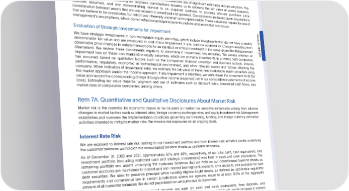 PARTII Item7. ManagementsDiscussionandAnalysisofFinancialConditionandResultsofOperations consideration payable on behalf of a customer, requires judgment. Incentives determined to be made to a customer, or payable on behalf of a customer, are recorded as a reduction to gross revenue. Changes in judgments with respect to theseassumptionsandestimatescouldimpacttheamountofrevenuerecognized. ValuationofGoodwillandIntangibles The valuation of assets acquired in a business combination requires the use of significant estimates and assumptions. The acquisition method of accounting for business combinations requires us to estimate the fair value of assets acquired, liabilities assumed, and any noncontrolling interest in an acquired business to properly allocate purchase price consideration between assets that are depreciated or amortized and goodwill. Our estimates are based upon assumptions that we believe to be reasonable, but which are inherently uncertain and unpredictable. These valuations require the use of managementsassumptions,whichdonotreflectunanticipatedeventsandcircumstancesthatmayoccur. EvaluationofStrategicInvestmentsforImpairment ANNU Wehave strategic investments in non-marketable equity securities, which include investments that do not have a readily AL determinable fair value and are measured at cost minus impairment, if any, and are adjusted for changes resulting from REPOR observablepricechangesinorderlytransactionsfor an identicalor similar investmentin the same issuer (the Measurement Alternative). We review these investments regularly to determine if impairment has occurred. We assess whether an T impairment loss on these non-marketable equity securities, which are primarily investments in privately held companies, has occurred based on qualitative factors such as the companies financial condition and business outlook, industry performance, regulatory, economic or technological environment, and other relevant events and factors affecting the company. When indicators of impairment exist, we estimate the fair value of these non-marketable equity securities using the market approach and/or the income approach. If any impairment is identified, we write down the investment to its fair value and record the correspondingchargethroughotherincome(expense),netin our consolidatedstatementsof income (loss). Estimating fair value requires judgment and use of estimates such as discount rates, forecasted cash flows, and marketdataofcomparablecompanies,amongothers. Item7A.QuantitativeandQualitativeDisclosuresAboutMarketRisk Market risk is the potential for economic losses to be incurred on market risk sensitive instruments arising from adverse changesinmarketfactorssuchasinterestrates,foreigncurrencyexchangerates,andequityinvestmentrisk. Management establishes and oversees the implementation of policies governing our investing, funding, and foreign currency derivative activities intended to mitigate market risks. We monitor risk exposures on an ongoing basis. InterestRateRisk Weare exposed to interest rate risk relating to our investment portfolio and from interest-rate sensitive assets underlying thecustomerbalancesweholdonourconsolidatedbalancesheetsascustomeraccounts. As of December 31, 2022 and 2021, approximately 57% and 40%, respectively, of our total cash, cash equivalents, and investment portfolio (excluding restricted cash and strategic investments) was held in cash and cash equivalents. The remaining portfolio and assets underlying the customer balances that we hold on our consolidated balance sheets as customeraccountsaremaintainedin interestand non-interestbearing bank deposits,time deposits,and available-for-sale debt securities. We seek to preserve principal while holding eligible liquid assets, as defined by applicable regulatory requirements and commercial law in certain jurisdictions where we operate, equal to at least 100% of the aggregate amountofallcustomerbalances.Wedonotpayinterestonamountsduetocustomers. Interest rate movements affect the interest income we earn on cash and cash equivalents, time deposits, and available-for-sale debt securities and the fair value of those securities. A hypothetical 100 basis points increase in interest rates would have resulted in a decrease in the fair value of our cash equivalents and available-for-sale debt securities investmentbyapproximately$161 million and $272 million at December31, 2022and 2021, respectively.Changesin the fair value of our available-for-sale debt securities resulting from such interest rate changes are reported as a component of accumulated other comprehensive income (“AOCI”) and are realized only if we sell the securities prior to their scheduled maturities or the declines in fair values are due to expected credit losses. As of December 31, 2022 and 2021, we had $10.4 billion and $9.0 billion, respectively, in fixed rate debt with varying maturity dates. Since these notes bear interest at fixed rates, they do not result in any financial statement risk associated with changes in interest rates. However, the fair value of these notes fluctuates when interest rates change, increasing in periodsofdeclininginterestratesanddeclininginperiodsofincreasinginterestrates. •2022AnnualReport 49