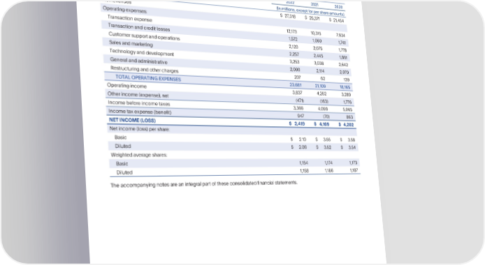 PARTIV ConsolidatedStatementsofIncome(Loss) PayPalHoldings,Inc. ConsolidatedStatementsofIncome(Loss) YearEndedDecember31, 2022 2021 2020 (In millions, except for per share amounts) Netrevenues $ 27,518 $ 25,371 $ 21,454 Operatingexpenses: Transactionexpense 12,173 10,315 7,934 Transactionandcreditlosses 1,572 1,060 1,741 Customersupportandoperations 2,120 2,075 1,778 Salesandmarketing 2,257 2,445 1,861 Technologyanddevelopment 3,253 3,038 2,642 Generalandadministrative 2,099 2,114 2,070 Restructuringandothercharges 207 62 139 TOTALOPERATINGEXPENSES 23,681 21,109 18,165 Operatingincome 3,837 4,262 3,289 Otherincome(expense),net (471) (163) 1,776 Incomebeforeincometaxes 3,366 4,099 5,065 Incometaxexpense(benefit) 947 (70) 863 NETINCOME(LOSS) $ 2,419 $ 4,169 $ 4,202 Netincome(loss)pershare: Basic $ 2.10 $ 3.55 $ 3.58 Diluted $ 2.09 $ 3.52 $ 3.54 Weightedaverageshares: Basic 1,154 1,174 1,173 Diluted 1,158 1,186 1,187 Theaccompanyingnotesareanintegralpartoftheseconsolidatedfinancialstatements. 58 •2022AnnualReport