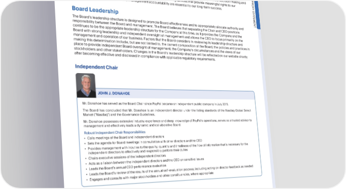 CORPORATEGOVERNANCE CorporateGovernance CorporategovernanceatPayPalisdesignedtopromotethelong-terminterestsofourstockholders,strengthenBoardand PRO managementaccountability,overseeriskassessmentandmanagementstrategies,fosterresponsibledecision-makingand engenderpublictrust.Webelievethatstrongcorporategovernancepracticesthatprovidemeaningfulrightstoour XY stockholdersandensureBoardandmanagementaccountabilityareessentialtoourlong-termsuccess. S T A TEMENT BoardLeadership TheBoardsleadershipstructureisdesignedtopromoteBoardeffectivenessandtoappropriatelyallocateauthorityand responsibilitybetweentheBoardandmanagement.TheBoardbelievesthatseparatingtheChairandCEOpositions continuestobetheappropriateleadershipstructurefortheCompanyatthistime,asitprovidestheCompanyandthe BoardwithstrongleadershipandindependentoversightofmanagementandallowstheCEOtofocusprimarilyonthe managementandoperationofourbusiness.FactorsthattheBoardconsidersinreviewingitsleadershipstructureand makingthisdeterminationinclude,butarenotlimitedto,thecurrentcompositionoftheBoard,thepoliciesandpracticesin placetoprovideindependentBoardoversightofmanagement,theCompanyscircumstancesandtheviewsofour stockholdersandotherstakeholders.ChangesintheBoardsleadershipstructurewillbereflectedonourwebsiteshortly after becomingeffectiveanddisclosedincompliancewithapplicableregulatoryrequirements. IndependentChair JOHNJ.DONAHOE Mr. DonahoehasservedastheBoardChairsincePayPalbecameanindependentpubliccompanyinJuly2015. The Board has concluded that Mr. Donahoe is an independent director under the listing standards of the Nasdaq Global Select Market(“Nasdaq”)andtheGovernanceGuidelines. Mr. Donahoe possesses extensive industry experience and deep knowledge of PayPals operations, serves as a trusted advisor to managementandeffectivelyleadsadynamicandcollaborativeBoard. RobustIndependentChairResponsibilities • Calls meetings of the Board and independentdirectors • Sets the agenda for Board meetings in consultation with other directors and the CEO • Provides managementwithinputastothequality,quantityandtimelinessoftheflowofinformationthatisnecessaryforthe independentdirectorstoeffectivelyandresponsiblyperformtheirduties • Chairs executive sessions of the independentdirectors • ActsasaliaisonbetweentheindependentdirectorsandtheCEOonsensitiveissues • LeadstheBoardsannualCEOperformanceevaluation • LeadstheBoardsreviewoftheresultsoftheannualself-evaluationprocess,includingactingondirectorfeedbackasneeded • Engagesandconsultswithmajorstockholdersandotherconstituencies,whereappropriate •2023ProxyStatement 21