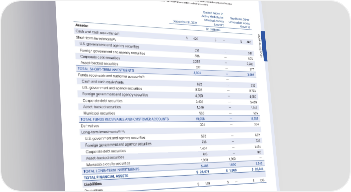PARTIV Note9—FairValueMeasurementofAssetsandLiabilities PayPalHoldings,Inc. NotestoConsolidatedFinancialStatements—(Continued) (1) Excludescashof$6.8billionnotmeasuredandrecordedatfairvalue. (2) Excludesrestrictedcashof$17millionandtimedepositsof$537millionnotmeasuredandrecordedatfairvalue. (3) Excludescash,timedeposits,andfundsreceivableof$18.8billionunderlyingfundsreceivableandcustomeraccountsnotmeasuredandrecordedatfairvalue. (4) Excludesnon-marketableequitysecuritiesof$1.8billionmeasuredusingtheMeasurementAlternativeorequitymethodaccounting. QuotedPricesin ActiveMarketsfor SignificantOther Identical Assets ObservableInputs December31,2021 (Level 1) (Level 2) (In millions) Assets: ANNU (1) AL Cashandcashequivalents $ 400 $ — $ 400 (2) REPOR Short-terminvestments : U.S. governmentandagencysecurities 537 — 537 Foreigngovernmentandagencysecurities 505 — 505 T Corporatedebtsecurities 2,285 — 2,285 Asset-backedsecurities 277 — 277 TOTALSHORT-TERMINVESTMENTS 3,604 — 3,604 (3) Fundsreceivableandcustomeraccounts :— Cashandcashequivalents 622 — 622 U.S. governmentandagencysecurities 8,723 — 8,723 Foreigngovernmentandagencysecurities 4,090 — 4,090 Corporatedebtsecurities 3,439 — 3,439 Asset-backedsecurities 1,549 — 1,549 Municipalsecurities 535 — 535 TOTALFUNDSRECEIVABLEANDCUSTOMERACCOUNTS 18,958 — 18,958 Derivatives 304 — 304 (2), (4) Long-terminvestments : U.S. governmentandagencysecurities 562 — 562 Foreigngovernmentandagencysecurities 736 — 736 Corporatedebtsecurities 1,434 — 1,434 Asset-backedsecurities 813 — 813 Marketableequitysecurities 1,860 1,860 — TOTALLONG-TERMINVESTMENTS 5,405 1,860 3,545 TOTALFINANCIALASSETS $ 28,671 $ 1,860 $ 26,811 Liabilities: Derivatives $ 130 $ — $ 130 (1) Excludescashof$4.8billionnotmeasuredandrecordedatfairvalue. (2) Excludesrestrictedcashof$109millionandtimedepositsof$635millionnotmeasuredandrecordedatfairvalue. (3) Excludescash,timedeposits,andfundsreceivableof$17.2billionunderlyingfundsreceivableandcustomeraccountsnotmeasuredandrecordedatfairvalue. (4) Excludesnon-marketableequitysecuritiesof$1.3billionmeasuredusingtheMeasurementAlternativeorequitymethodaccounting. Ourmarketableequitysecuritiesare valued using quoted prices for identicalassets in active markets (Level 1). There are no active markets for our crypto asset safeguarding liability or the corresponding safeguarding asset. Accordingly, we have valuedtheassetandliabilityusingquotedpricesontheactiveexchangethathasbeenidentifiedastheprincipalmarketfor the underlying crypto assets (Level 2). All other financial assets and liabilities are valued using quoted prices for identical instruments in less active markets, readily available pricing sources for comparable instruments, or models using market observableinputs(Level2). •2022AnnualReport 91