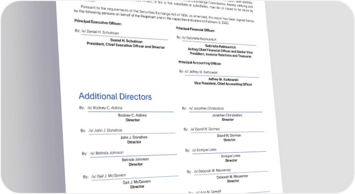 PARTIV Signatures PowerofAttorney KNOWALLPERSONSBYTHESEPRESENTS,thateachpersonwhosesignatureappearsbelowconstitutesandappoints Daniel H. Schulman, Gabrielle Rabinovitch, Bimal Patel, Brian Y. Yamasaki and Jeffrey W. Karbowski, and each or any one of them, each with the power of substitution, his or her attorney-in-fact, to sign any amendments to this report, with exhibits thereto and other documents in connection therewith, with the Securities and Exchange Commission, hereby ratifying and confirming all that each of said attorneys-in-fact, or his or her substitute or substitutes, may do or cause to be done by virtue hereof. Pursuant to the requirements of the Securities Exchange Act of 1934, as amended, this report has been signed below bythefollowingpersonsonbehalfoftheRegistrantandinthecapacitiesindicatedonFebruary9,2023. PrincipalExecutiveOfficer: PrincipalFinancialOfficer: By: /s/ Daniel H. Schulman By: /s/ Gabrielle Rabinovitch DanielH.Schulman GabrielleRabinovitch President,ChiefExecutiveOfficerandDirector ActingChiefFinancialOfficerandSeniorVice President,InvestorRelationsandTreasurer PrincipalAccountingOfficer: By: /s/ Jeffrey W. Karbowski JeffreyW.Karbowski VicePresident,ChiefAccountingOfficer AdditionalDirectors By: /s/ RodneyC.Adkins By: /s/ JonathanChristodoro RodneyC.Adkins JonathanChristodoro Director Director By: /s/ John J. Donahoe By: /s/ DavidW. Dorman JohnJ.Donahoe DavidW.Dorman Director Director By: /s/ Belinda Johnson By: /s/ EnriqueLores BelindaJohnson EnriqueLores Director Director By: /s/ Gail J. McGovern By: /s/ DeborahM.Messemer Gail J. McGovern DeborahM.Messemer Director Director By: /s/ DavidM.Moffett By: /s/ AnnM.Sarnoff DavidM.Moffett AnnM.Sarnoff Director Director By: /s/ Frank D. Yeary FrankD.Yeary Director 124 •2022AnnualReport