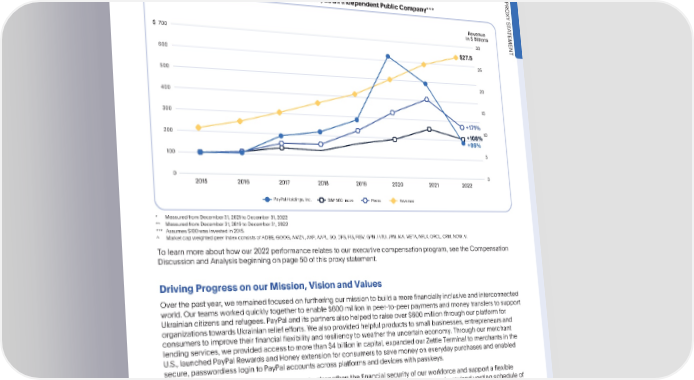 PROXYSTATEMENTSUMMARY Our2022KeyHighlights OurStockPricePerformance PayPalhasatrackrecordofcreatingstockholdervalue,anddespitemarketvolatilityoverthepastyear,theCompanyhas returnedapproximately86%sincebecominganindependentpubliccompany.Ourone-year*andthree-year**total stockholderreturnwere-62%and-34%,respectively. PRO TotalStockholderReturn(“TSR”)asanIndependentPublicCompany*** XY S T A Revenue TEMENT in $ Billions $ 700 30 $27.5 600 25 500 20 400 15 300 +171% +108%10 200 +86% 100 5 0 0 2015 2016 2017 2018 2019 2020 2021 2022 PayPal Holdings, Inc. S&P 500 Index Peers Revenue * MeasuredfromDecember31,2021toDecember31,2022 ** MeasuredfromDecember31,2019toDecember31,2022 *** Assumes$100wasinvestedin2015. ^ MarketcapweightedpeerindexconsistsofADBE,GOOG,AMZN,AXP,AAPL,SQ,DFS,FIS,FISV,GPN,INTU,JPM,MA,META,NFLX,ORCL,CRM,NOW,V. Tolearnmoreabouthowour2022performancerelatestoourexecutivecompensationprogram,seetheCompensation DiscussionandAnalysisbeginningonpage50ofthisproxystatement. DrivingProgressonourMission,VisionandValues Overthepastyear,weremainedfocusedonfurtheringourmissiontobuildamorefinanciallyinclusiveandinterconnected world. Our teamsworkedquicklytogethertoenable$600millioninpeer-to-peerpaymentsandmoneytransferstosupport Ukrainian citizens and refugees. PayPal and its partners also helped to raise over $600 million through our platform for organizationstowardsUkrainianreliefefforts.We also providedhelpful productsto small businesses,entrepreneursand consumerstoimprovetheirfinancialflexibilityandresiliencyto weathertheuncertaineconomy.Throughourmerchant lendingservices,weprovidedaccesstomorethan$4billionincapital,expandedourZettleTerminaltomerchantsinthe U.S., launched PayPal RewardsandHoneyextensionforconsumerstosavemoneyoneverydaypurchasesandenabled secure,passwordlesslogintoPayPalaccountsacrossplatformsanddeviceswithpasskeys. Wehavealsocontinuedtopursueinitiativestostrengthenthefinancialsecurityofourworkforceandsupportaflexible workplace.Thisincludedfinancialwellnessawardstohourlyandentry-levelemployeesandarevisedvestingscheduleof ourrestrictedstockunit grantsto give employeesearlierandmorefrequentaccesstotheirshares.Welaunchedour LeadershipPrinciples,whichpromotebehaviorstosupportournextchapterofgrowthanddrivedeeperunderstandingof ourcorevaluesofInclusion,Innovation,WellnessandCollaboration.Wecontinuetohavesuccesswithourhybridworking model,whichpreservestheflexibilitythatis importantto our employeeswhilealsoprovidingopportunitiesforin-person collaborationandprofessionaldevelopment. •2023ProxyStatement 5