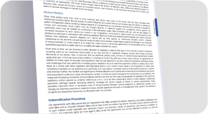 PARTIV Note13—CommitmentsandContingencies PayPalHoldings,Inc. NotestoConsolidatedFinancialStatements—(Continued) On November 2, 2022, a putative shareholder derivative action captioned Shah v. Daniel Schulman, et al., Case No. 22-cv-1445, was filed in the U.S. District Court for the District of Delaware (the “Shah Action”), purportedly on behalf of the Company.TheShahActionisbasedonthesameallegedfactsandcircumstancesasthePPHSecuritiesAction,andnames certain of our officers, including our Chief Executive Officer and former Chief Financial Officer, and members of our Board of Directors, as defendants. The Shah Action alleges claims for breach of fiduciary duty, aiding and abetting breach of fiduciary duty, unjust enrichment, waste of corporate assets, and violations of the Securities Exchange Act of 1934, and seekstorecoverdamagesonbehalfoftheCompany. GeneralMatters ANNU Other third parties have from time to time claimed, and others may claim in the future, that we have infringed their intellectual property rights. We are subject to patent disputes and expect that we will increasingly be subject to additional AL patent infringement claims involving various aspects of our business as our products and services continue to expand in REPOR scope and complexity. Such claims may be brought directly or indirectly against our companies and/or against our customers (who may be entitled to contractual indemnification under their contracts with us), and we are subject to T increased exposure to such claims as a result of our acquisitions, particularly in cases where we are introducing new products or services in connection with such acquisitions. We have in the past been forced to litigate such claims, and we believe that additional lawsuits alleging such claims will be filed against us. Intellectual property claims, whether meritorious or not, are time-consuming and costly to defend and resolve, could require expensive changes in our methods of doing business, or could require us to enter into costly royalty or licensing agreements on unfavorable terms or make substantial paymentsto settle claims or to satisfy damagesawardedby courts. From time to time, we are involved in other disputes or regulatory inquiries that arise in the ordinary course of business, including suits by our customers (individually or as class actions) or regulators alleging, among other things, improper disclosure of our prices, rules, or policies, that our practices, prices, rules, policies, or customer/user agreements violate applicable law, or that we have acted unfairly or not acted in conformity with such prices, rules, policies, or agreements. In addition to these types of disputes and regulatory inquiries, our operations are also subject to regulatory and legal review andchallengesthatmayreflecttheincreasingglobalregulatoryfocusto whichthepaymentsindustryis subjectand,when taken as a whole with other regulatory and legislative action, such actions could result in the imposition of costly new compliance burdens on our business and customers and may lead to increased costs and decreased transaction volume andrevenue.Further,thenumberandsignificanceofthesedisputesandinquiriesareincreasingasourbusinesshasgrown andexpandedinscaleandscope,includingthenumberofactiveaccountsandpaymentstransactionsonourplatform,the rangeandincreasingcomplexityoftheproductsandservicesthatweoffer,andourgeographicaloperations.Anyclaimsor regulatory actions against us, whether meritorious or not, could be time consuming, result in costly litigation, settlement payments, damage awards (including statutory damages for certain causes of action in certain jurisdictions), fines, penalties, injunctive relief, or increased costs of doing business through adverse judgment or settlement, require us to changeour business practices in expensive ways, require significant amounts of management time, result in the diversion of significant operational resources, or otherwise harm our business. IndemnificationProvisions Our agreements with eBay governing our separation from eBay provide for specific indemnity and liability obligations for both eBay and us. Disputes between eBay and us have arisen and others may arise in the future, and an adverse outcome in such matters could materially and adversely impact our business, results of operations, and financial condition. In addition, the indemnity rights we have against eBay under the agreements may not be sufficient to protect us, and our indemnityobligationstoeBaymaybesignificant. In the ordinary course of business, we include indemnification provisions in certain of our agreements with parties with whom we have commercial relationships. Under these contracts, we generally indemnify, hold harmless, and agree to reimburse the indemnified party for losses suffered or incurred by the indemnified party in connection with claims by any third party with respect to our domain names, trademarks,logos, and other brandingelementsto the extentthat such marks are related to the subject agreement. We have provided an indemnity for other types of third-party claims, which may include indemnities related to intellectual property rights, confidentiality, willful misconduct, data privacy obligations, and certain breach of contract claims, among others. We have also provided an indemnity to our payments processors in the event of card association fines against the processor arising out of conduct by us or our customers. It is not possible to determine the maximum potential loss under these indemnification provisions due to our limited history of prior indemnificationclaimsandtheuniquefactsandcircumstancesinvolvedineachparticularsituation. •2022AnnualReport 107