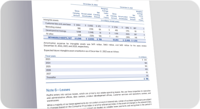 PARTIV Note5—GoodwillandIntangibleAssets PayPalHoldings,Inc. NotestoConsolidatedFinancialStatements—(Continued) IntangibleAssets Thecomponentsofidentifiableintangibleassetswereasfollows: December31,2022 December31,2021 Weighted Weighted Average Average Gross Net Useful Gross Net Useful Carrying Accumulated Carrying Life Carrying Accumulated Carrying Life Amount Amortization Amount (Years) Amount Amortization Amount (Years) (In millions, except years) Intangible assets: Customerlistsanduserbase $ 1,664 $ (1,092) $ 572 7 $ 1,726 $ (919) $ 807 7 Marketingrelated 395 (339) 56 5 405 (315) 90 5 Developedtechnology 1,099 (1,048) 51 3 1,109 (822) 287 3 All other 438 (329) 109 7 454 (306) 148 7 INTANGIBLEASSETS,NET $3,596 $ (2,808) $ 788 $3,694 $ (2,362) $ 1,332 Amortization expense for intangible assets was $471 million, $443 million, and $451 million for the years ended December31,2022,2021,and2020,respectively. ExpectedfutureintangibleassetamortizationasofDecember31,2022wasasfollows: Fiscal years: (In millions) 2023 $ 214 2024 196 2025 160 2026 103 2027 65 Thereafter 50 $ 788 Note6—Leases PayPal enters into various leases, which are primarily real estate operating leases. We use these properties for executive and administrative offices, data centers, product development offices, customer services and operations centers, and warehouses. Whileamajorityofourleaseagreementsdonotcontainanexplicitinterestrate,certainofourleaseagreementsaresubject to changesbasedontheConsumerPriceIndexoranotherreferencedindex.Intheeventofchangestotherelevantindex, lease liabilities are not remeasured and instead are treated as variable lease payments and recognized in the period in whichtheobligationforthosepaymentsisincurred. Theshort-termleaseexemptionhasbeenadoptedforallleaseswithadurationoflessthan12months. PayPals lease portfolio includes a small number of subleases. A sublease situation can arise when currently leased real estatespaceisavailableandissurplustooperationalrequirements. AsofDecember31,2022,wehadnofinanceleases. 78 •2022AnnualReport