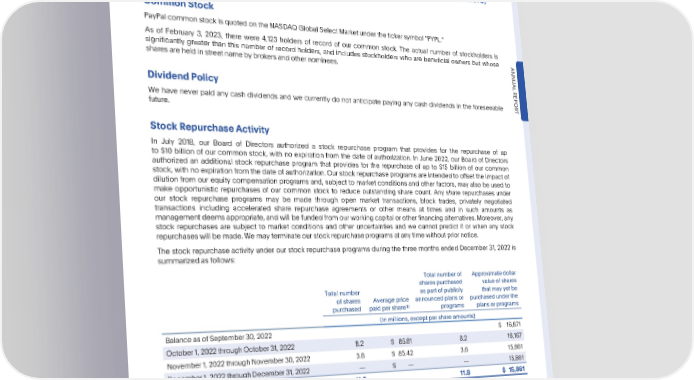 PARTII Item5.MarketforRegistrantsCommonEquity,RelatedStockholderMatters,andIssuerPurchasesofEquitySecurities Part II Item5.MarketforRegistrantsCommonEquity,RelatedStockholderMatters, andIssuerPurchasesofEquitySecurities CommonStock PayPalcommonstockisquotedontheNASDAQGlobalSelectMarketunderthetickersymbol“PYPL.” As of February 3, 2023, there were 4,123 holders of record of our common stock. The actual number of stockholders is significantly greater than this number of record holders, and includes stockholders who are beneficial owners but whose ANNU sharesareheldinstreetnamebybrokersandothernominees. AL DividendPolicy REPOR Wehaveneverpaid any cash dividends and we currently do not anticipate paying any cash dividends in the foreseeable T future. StockRepurchaseActivity In July 2018, our Board of Directors authorized a stock repurchase program that provides for the repurchase of up to $10 billion of our common stock, with no expiration from the date of authorization. In June 2022, our Board of Directors authorized an additional stock repurchase program that provides for the repurchase of up to $15 billion of our common stock, with no expiration from the date of authorization. Our stock repurchase programs are intended to offset the impact of dilution from our equity compensation programs and, subject to market conditions and other factors, may also be used to make opportunistic repurchases of our common stock to reduce outstanding share count. Any share repurchases under our stock repurchase programs may be made through open market transactions, block trades, privately negotiated transactions including accelerated share repurchase agreements or other means at times and in such amounts as managementdeemsappropriate,andwillbefundedfromourworkingcapitalorotherfinancingalternatives.Moreover,any stock repurchases are subject to market conditions and other uncertainties and we cannot predict if or when any stock repurchaseswillbemade.Wemayterminateourstockrepurchaseprogramsatanytimewithoutpriornotice. The stock repurchase activity under our stock repurchase programs during the three months ended December 31, 2022 is summarizedasfollows: Total numberof Approximatedollar sharespurchased valueofshares Total number aspartofpublicly that mayyetbe of shares Averageprice announcedplansor purchasedunderthe (1) purchased paidpershare programs plansorprograms (In millions, except per share amounts) BalanceasofSeptember30,2022 $ 16,871 October1,2022throughOctober31,2022 8.2 $ 85.81 8.2 16,167 November1,2022throughNovember30,2022 3.6 $ 85.42 3.6 15,861 December1,2022throughDecember31,2022 — $ — — 15,861 BALANCEASOFDECEMBER31,2022 11.8 11.8 $ 15,861 (1) Averagepricepaidpershareforopenmarketpurchasesincludesbrokercommissions. Item6.RemovedandReserved •2022AnnualReport 29