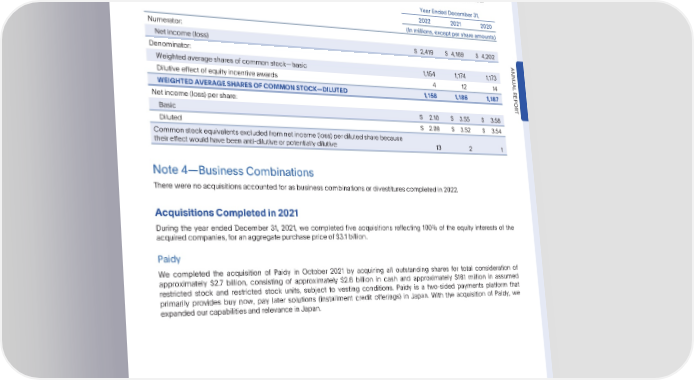 PARTIV Note3—NetIncome(loss)PerShare PayPalHoldings,Inc. NotestoConsolidatedFinancialStatements—(Continued) Thefollowingtablesetsforththecomputationofbasicanddilutednetincome(loss)persharefortheperiodsindicated: YearEndedDecember31, 2022 2021 2020 (In millions, except per share amounts) Numerator: Netincome(loss) $ 2,419 $ 4,169 $ 4,202 Denominator: ANNU Weightedaveragesharesofcommonstock—basic 1,154 1,174 1,173 AL Dilutive effect of equity incentive awards 4 12 14 REPOR WEIGHTEDAVERAGESHARESOFCOMMONSTOCK—DILUTED 1,158 1,186 1,187 Netincome(loss)pershare: T Basic $ 2.10 $ 3.55 $ 3.58 Diluted $ 2.09 $ 3.52 $ 3.54 Commonstockequivalentsexcludedfromnetincome(loss)perdilutedsharebecause their effect would have been anti-dilutive or potentially dilutive 13 2 1 Note4—BusinessCombinations Therewerenoacquisitionsaccountedforasbusinesscombinationsordivestiturescompletedin2022. AcquisitionsCompletedin2021 During the year ended December 31, 2021, we completed five acquisitions reflecting 100% of the equity interests of the acquiredcompanies,foranaggregatepurchasepriceof$3.1billion. Paidy We completed the acquisition of Paidy in October 2021 by acquiring all outstanding shares for total consideration of approximately $2.7 billion, consisting of approximately $2.6 billion in cash and approximately $161 million in assumed restricted stock and restricted stock units, subject to vesting conditions. Paidy is a two-sided payments platform that primarily provides buy now, pay later solutions (installment credit offerings) in Japan. With the acquisition of Paidy, we expandedourcapabilitiesandrelevanceinJapan. •2022AnnualReport 75