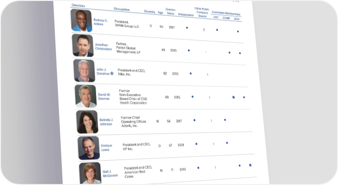 PROXYSTATEMENTSUMMARY 2023DirectorNominees 2023DirectorNominees Thefollowingtablesprovidesummaryinformationaboutourdirectornominees.Allour2023directornomineesare independentexceptMr.Schulman,PayPalsPresidentandCEO.Directorsareelectedannuallybyamajorityofvotescast. TheBoardofDirectorsrecommendsthatyouvote“FOR”theelectionofeachofthe12nominees.Seepage12ofthisproxy statementforthisproposal. OtherPublic CommitteeMemberships Director Company Directors Occupation Diversity Age Since Independent Boards ARC COMP GOV RodneyC. President, D 64 2017 3 Adkins 3RAMGroupLLC Jonathan Partner, Christodoro Patriot Global 46 2015 - Management,LP JohnJ. PresidentandCEO, 62 2015 1 Donahoe Nike, Inc. Former DavidW. Non-Executive 69 2015 1 Dorman BoardChairofCVS HealthCorporation BelindaJ. FormerChief Johnson OperatingOfficer, W 56 2017 1 Airbnb,Inc. Enrique PresidentandCEO, D 57 2021 1 Lores HPInc. Gail J. PresidentandCEO, McGovern AmericanRed W 71 2015 1 Cross FormerMajor DeborahM. MarketManaging W 65 2019 2 Messemer Partner, KPMG (retired) IndependentBoardChair CommitteeChair ARC=Audit,RiskandComplianceCommittee(“ARCCommittee”) COMP=CompensationCommittee GOV=CorporateGovernanceandNominatingCommittee W=Woman D=DiverseEthnicity 6 •2023ProxyStatement