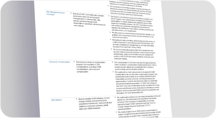 CORPORATEGOVERNANCE StockholderEngagement Thetablebelowprovidesanoverviewofthekeytopics,areasofstockholderfocusandmanagementsresponsescovered duringour2022andearly2023stockholderoutreachmeetings. KeyTopic AreaofStockholderFocus HowWeResponded BoardCompositionand • Boarddiversity,skills and refreshment; • Since2017,wehaveaddedfivediversedirectorstotheBoard, SuccessionPlanning boardandexecutivesuccessionplanning eachofwhompossessastrongmixofskills,qualifications, backgroundsandexperienceandhascontributedtoand enhancedtheoveralleffectivenessoftheBoard. • TheGovernanceCommitteeregularlyoverseesandplansfor director succession and Board refreshment,andthefull Board overseesexecutivesuccessionplanning.TheBoardreviews executivesuccessionplanningatleastannually. Risk Managementand • BoardandARCCommitteeriskoversight; • TheBoardiscommittedtorobustandeffectiveoversightofour Oversight governancestructureandprogram ERCMProgram.EachoftheBoardcommitteeshasoversight managementofcybersecurity,data responsibility for clearly defined risks outlined in each of their privacy and data management; respectivecommitteecharters.TheARCCommitteeoversees responsibleAIpractices; administrationof andreviewsouroverallriskmanagementframeworkand user policies reports to the full Board on risk matters, including cybersecurity anddataprivacy,onaregularbasis. • Wediscussedourcommitmenttopreservingtheintegrityofour platform and to ensuring the safety, security and privacy of our customersandothers. • Managingkeyrisks,includingcybersecurityanddataprivacy,is avital componentofourenterprise-wideERCMProgramand includesoversightandmanagementbyourChiefInformation Security Officer and Chief Privacy Officer. • Wefocusonintegratingappropriatedatamanagementand security controls across our business, conduct privacy impact assessments,certify our informationsecurity management systemtoISO27001andrequiremandatoryemployeeand contractor training. ExecutiveCompensation • Performancemetricsincompensation • TheCompensationCommitteeevaluatestheappropriateness program;incorporationofESG of the Companyscompensation-relatedperformancemetrics considerations,includingDIE&B at least annually, taking into consideration the Companys considerations,into executive overall strategy and stockholder feedback. compensation • Wecontinuedourmulti-yearprocesstoincorporateDIE&B considerationsintoourexecutivecompensationprogram,and assessedtheactionstakenbyourleadersintendedtodrive measurableoutcomesovertime,includingincreasingthe representationof womenandminoritieswithinourleadership andgeneralemployeepopulation.For2022,theCompanys near-termfocuswasonstrengtheningthefoundationforamore inclusive and diverse culture, including by evaluating our senior leaders actions to promote DIE&B across the organizationand throughoutthefull employeelifecycle. ESGMatters • BoardoversightofESGstrategy;climate • Wecontinuedtoenhanceournon-financialreportingeffortsand changestrategyandreportingunder alignedourESGdisclosureswithestablishedframeworks, establishedframeworks;financialinclusion includingIFRSFoundationsSustainabilityAccounting initiatives; employee wellness; global StandardsBoard(“SASB”)standardsandTaskForceon talent and DIE&B strategies Climate-RelatedFinancialDisclosures(“TCFD”) recommendations. • Wemadeprogressonour2025science-basedtargetsto reduceourgreenhousegasemissionsandencourageclimate actions across our supply chain, important steps toward our long-termgoaltoreachnet-zeroGHGemissionsby2040. • Discussedourapproachtoglobaltalentmanagementinan evolvingworkplace,includingourfocusonpromotingaculture of flexibility and community, enhancementsto our employee total wellness initiatives and intersections of our global talent andDIE&Bstrategies. 32 •2023ProxyStatement