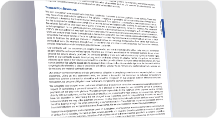 PARTIV Note2—Revenue PayPalHoldings,Inc. NotestoConsolidatedFinancialStatements—(Continued) Note2—Revenue Weenableour customers to send and receive payments. We earn revenue primarily by completing payment transactions for our customers on our payments platform and from other value added services. Our revenues are classified into two categories:transactionrevenuesandrevenuesfromothervalueaddedservices. TransactionRevenues Weearntransaction revenues primarily from fees paid by our customers to receive payments on our platform. These fees mayhaveafixedandvariablecomponent.The variable component is generally a percentage of the value of the payment ANNU amountandisknownatthetimethetransactionis processed.For a portion of our transactions,the variable component of the fee is eligible for reimbursement when the underlying transaction is approved for a refund. We estimate the amount of AL fee refunds that will be processed each quarter and record a provision against our transaction revenues. The volume of REPOR activity processed on our payments platform, which results in transaction revenue, is referred to as Total Payment Volume (“TPV”). We earn additional fees from merchants and consumers on transactions where we perform currency conversion, T whenweenablecross-bordertransactions(i.e., transactions where the merchant and consumer are in different countries), to facilitate the instant transfer of funds for our customers from their PayPal or Venmo account to their bank account or debit card, to facilitate the purchase and sale of cryptocurrencies, as contractual compensation from sellers that violate our contractual terms (for example, through fraud or counterfeiting), and other miscellaneous fees. Our transaction revenues are also reducedbycertainincentivesprovidedtoourcustomers. Our contracts with our customers are usually open-ended and can be terminated by either party without a termination penalty after the notice period has lapsed. Therefore, our contracts are defined at the transaction level and do not extend beyond the service already provided. Our contracts generally renew automatically without any significant material rights. Some of our contracts include tiered pricing, which are based primarily on volume. The fee charged per transaction is adjustedupordownifthevolumeprocessedforaspecifiedperiodisdifferentfrompriorperioddefinedvolumes.Wehave concludedthatthisvolume-basedpricingapproachdoesnotconstituteafuturematerialrightsincethediscountiswithina range typically offered to a class of customers with similar volume. We do not have any capitalized contract costs and we donotcarryanymaterialcontractbalances. Our primary service comprises a single performance obligation to complete payments on our payments platform for our customers. Using our risk assessment tools, we perform a transaction risk assessment on individual transactions to determine whether a transaction should be authorized for completion on our payments platform. When we authorize a transaction,webecomeobligatedtoourcustomertocompletethepaymenttransaction. Werecognizefeeschargedtoourcustomersprimarilyonagrossbasisastransactionrevenuewhenwearetheprincipalin respect of completing a payment transaction. As a principal to the transaction, we control the service of completing payments on our payments platform. We bear primary responsibility for the fulfillment of the payment service, contract directly with our customers, control the product specifications,and define the value proposal from our services. Further, we have full discretion in determining the fee charged to our customers, which is independent of the costs we incur in instances where we may utilize payment processors or other financial institutions to perform services on our behalf. We therefore bear full margin risk when completing a payment transaction. These fees paid to payment processors and other financial institutions are recognized as transaction expense. We are also responsiblefor providing customer support. Topromoteengagementandacquirenewusersonourplatform,wemayprovideincentivestomerchantsandconsumers in various forms including discounts on fees, rebates, rewards, and coupons. Evaluating whether an incentive is a payment to a customer requires judgment. Incentives that are determined to be consideration payable to a customer or paid on behalf of a customer are recognized as a reduction of revenue. Certain incentives paid to users that are not our customers are classified as sales and marketing expense. We provide merchants and consumers with protection programs for certain transactions completed on our payments platform. These programs are intended to protect both merchants and consumers from loss primarily due to fraud and counterpartyperformance.Theseprotectionprogramsdonotprovideaseparateservicetoourcustomersandweestimate andrecordassociatedcostsintransactionandcreditlossesduringtheperiodthepaymenttransactioniscompleted. RevenuesfromOtherValueAddedServices Weearnrevenuesfromothervalueaddedservices,whicharecomprisedprimarilyofrevenueearnedthroughpartnerships, referral fees, subscription fees, gateway fees, and other services that we provide to our merchants and consumers. These •2022AnnualReport 73