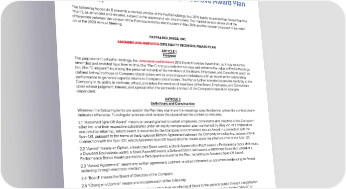 PAYPALHOLDINGS,INC.2015EQUITYINCENTIVEAWARDPLAN(MARKED) APPENDIXB: PayPalHoldings,Inc.2015EquityIncentiveAwardPlan (marked) ThefollowingAppendixBpresentsamarkedversionofthePayPalHoldings,Inc.2015EquityIncentivePlanAwardPlan(the “Plan”), as amendedandrestated,subjecttotheapprovalofourstockholders.Themarkedversionshowsallofthe differencesbetweentheversionofthePlanapprovedbystockholdersinMay2018andtheversionproposedtobevoted onatthe2023AnnualMeeting. PAYPALHOLDINGS,INC. AMENDEDANDRESTATED2015EQUITYINCENTIVEAWARDPLAN ARTICLE1 Purpose ThepurposeofthePayPalHoldings,Inc.AmendedandRestated2015EquityIncentiveAwardPlan,asitmaybefurther amendedandrestatedfromtimetotime(the“Plan”)istopromotethesuccessandenhancethevalueofPayPalHoldings, Inc. (the “Company”)bylinkingthepersonalinterestsof themembersoftheBoard,Employees,andConsultants(eachas definedbelow)tothoseofCompanystockholdersandbyprovidingsuchindividualswithanincentiveforoutstanding performancetogeneratesuperiorreturnstoCompanystockholders.ThePlanisfurtherintendedtoprovideflexibilitytothe Companyinitsabilitytomotivate,attract,andretaintheservicesofmembersoftheBoard,Employees,andConsultants uponwhosejudgment,interest,andspecialeffortthesuccessfulconductoftheCompanysoperationislargely dependent. ARTICLE2 DefinitionsandConstruction WhereverthefollowingtermsareusedinthePlantheyshallhavethemeaningsspecifiedbelow,unlessthecontextclearly indicatesotherwise.Thesingularpronounshallincludethepluralwherethecontextsoindicates. 2.1 “AssumedSpin-OffAward”meansanawardgrantedtocertainemployees,consultantsanddirectorsoftheCompany, eBayInc.andtheirrespectivesubsidiariesunderanequitycompensationplanmaintainedbyeBayInc.oracorporation acquiredbyeBayInc.,whichawardisassumedbytheCompanyandconvertedintoanAwardinconnectionwiththe Spin-Off, pursuant to the terms of the Employee Matters AgreementbetweentheCompanyandeBayInc.,enteredintoin connectionwiththeSpin-Off,whichAssumedSpin-OffAwardshallbeissuedupontheeffectivetimeoftheSpin-Off. 2.2 “Award”meansanOption,aRestrictedStockaward,aStockAppreciationRightaward,aPerformanceStockUnitaward, aDividendEquivalentsaward,aStockPaymentaward,aDeferredStockUnitaward,aRestrictedStockUnitawardora PerformanceBonusAwardgrantedtoaParticipantpursuanttothePlan,includinganAssumedSpin-OffAward. 2.3 “AwardAgreement”meansanywrittenagreement,contract,orotherinstrumentordocumentevidencinganAward, includingthroughelectronicmedium. 2.4 “Board” meanstheBoardofDirectorsoftheCompany. 2.5 “ChangeinControl”meansandincludeseachofthefollowing: (a) A transaction or series of transactions (other than an offering of Stock to the general public through a registration statementfiled with the U.S. Securities and Exchange Commission)wherebyany“person”orrelated“group”of “persons”(assuchtermsareusedinSections13(d)and14(d)(2)oftheExchangeAct)(otherthantheCompany,anyof its subsidiaries, an employee benefit plan maintainedby the Companyor any of its subsidiariesor a “person” that, prior to such transaction,directly or indirectly controls, is controlled by, or is under common control with, the Company) directly or indirectly acquires beneficial ownership (within the meaning of Rule 13d-3 under the Exchange Act) of securities of the Companypossessingmorethan50%ofthetotalcombinedvotingpoweroftheCompanyssecurities outstandingimmediatelyaftersuchacquisition;or (b) During any period of two consecutiveyears,individualswho, at the beginningof such period,constitutethe Board togetherwithanynewdirector(s)(otherthanadirectordesignatedbyapersonwhoshallhaveenteredintoan agreementwiththeCompanytoeffectatransactiondescribedinSection2.5(a)orSection2.5(c))whoseelectionby 120 •2023ProxyStatement