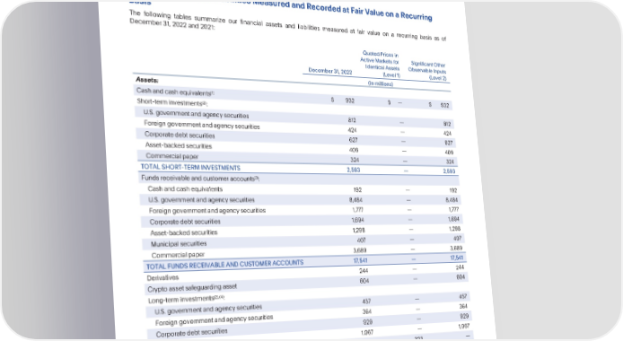 PARTIV Note9—FairValueMeasurementofAssetsandLiabilities PayPalHoldings,Inc. NotestoConsolidatedFinancialStatements—(Continued) Note9—FairValueMeasurementofAssetsandLiabilities FinancialAssetsandLiabilitiesMeasuredandRecordedatFairValueonaRecurring Basis The following tables summarize our financial assets and liabilities measured at fair value on a recurring basis as of December31,2022and2021: QuotedPricesin ActiveMarketsfor SignificantOther Identical Assets ObservableInputs December31,2022 (Level 1) (Level 2) (In millions) Assets: (1) Cashandcashequivalents $ 932 $ — $ 932 (2) Short-terminvestments : U.S. governmentandagencysecurities 812 — 812 Foreigngovernmentandagencysecurities 424 — 424 Corporatedebtsecurities 627 — 627 Asset-backedsecurities 406 — 406 Commercialpaper 324 — 324 TOTALSHORT-TERMINVESTMENTS 2,593 — 2,593 (3) Fundsreceivableandcustomeraccounts : Cashandcashequivalents 192 — 192 U.S. governmentandagencysecurities 8,484 — 8,484 Foreigngovernmentandagencysecurities 1,777 — 1,777 Corporatedebtsecurities 1,694 — 1,694 Asset-backedsecurities 1,298 — 1,298 Municipalsecurities 407 — 407 Commercialpaper 3,689 — 3,689 TOTALFUNDSRECEIVABLEANDCUSTOMERACCOUNTS 17,541 — 17,541 Derivatives 244 — 244 Cryptoassetsafeguardingasset 604 — 604 (2),(4) Long-terminvestments : U.S. governmentandagencysecurities 457 — 457 Foreigngovernmentandagencysecurities 364 — 364 Corporatedebtsecurities 929 — 929 Asset-backedsecurities 1,067 — 1,067 Marketableequitysecurities 323 323 — TOTALLONG-TERMINVESTMENTS 3,140 323 2,817 TOTALFINANCIALASSETS $ 25,054 $ 323 $ 24,731 Liabilities: Derivatives $ 298 $ — $ 298 Cryptoassetsafeguardingliability 604 — 604 TOTALFINANCIALLIABILITIES $ 902 $ — $ 902 Seenextpageforfootnotes. 90 •2022AnnualReport