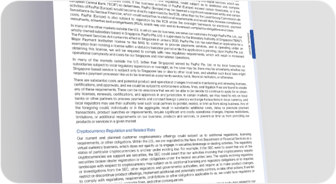 PARTI Item1A.RiskFactors OutsideoftheU.S.,weprincipallyprovideourservicestocustomersintheEuropeanEconomicArea(“EEA”)andtheUnited Kingdom(“U.K.”) through PayPal (Europe), our wholly-ownedsubsidiarythat is licensed and subject to regulation as a credit institution in Luxembourg. PayPal (Europe) may be subject to enforcement actions and significant fines if it violates applicable requirements. Additionally, compliance with applicable laws and regulations could become more costly and operationally difficult to manage due to potentially inconsistent interpretations and domestic regulations by various countries in the region. Applicable regulation relating to payments, anti-money laundering and digital services, which are key focus areas of regulators and subject to extensive new regulation, could subject us to additional and complex obligations, risks and associated costs. If the business activities of PayPal (Europe) exceed certain thresholds, or if the European Central Bank (“ECB”) so determines, PayPal (Europe) may be deemed a significant supervised entity and certain activities of PayPal (Europe) would become directly supervised by the ECB, rather than by the Luxembourg Commission de Surveillance du Secteur Financier, which could subject us to additional requirementsand would likely increase compliance costs. PayPal (Europe) is also subject to regulation by the ECB under the oversight framework for electronic payment instruments,schemesandarrangements(PISA),whichmayalsoleadtoincreasedcomplianceobligationsandcosts. ANNU In manyoftheothermarketsoutsidetheU.S.inwhichwedobusiness,weserveourcustomersthroughPayPalPte.Ltd.,our wholly-ownedsubsidiarybasedinSingapore.PayPalPte.Ltd.issupervisedbytheMonetaryAuthorityofSingapore(“MAS”). AL ThePaymentServicesActcameintoeffectinSingaporeinJanuary2020.PayPalPte.Ltd.hassubmittedanapplicationfora REPOR Major Payment Institution license to the MAS to continue to provide payments services, and is operating under an exemptionfromholdingalicensewithina statutorytransition period while the application is pending. Upon PayPal Pte. Ltd. T obtaining this license, we will be required to comply with new regulatory requirements, which will result in increased operationalcomplexityandcostsforourSingaporeandinternationaloperations. In many of the markets outside the U.S. (other than Singapore) served by PayPal Pte. Ltd. or by local branches or subsidiaries subject to local regulatory supervision or oversight, as the case may be, there may be uncertainty whether our Singapore-based service is subject only to Singapore law or also to other local laws, and whether such local laws might require a paymentprocessorlikeustobelicensedasapaymentsservice,bank,financialinstitution,orotherwise. There are substantial costs and potential product and operational changes involved in maintaining and renewing licenses, certifications, and approvals, and we could be subject to enforcement actions, fines, and litigation if we are found to violate any of these requirements. There can be no assurance that we will be able to (or decide to) continue to apply for or obtain any licenses, renewals, certifications, and approvals in any jurisdiction. In certain markets, we may need to rely on local banks or other partners to process payments and conduct foreign currency exchange transactions in local currency, and local regulators may use their authority over such local partners to prohibit, restrict, or limit us from doing business. Any of the foregoing could, individually or in the aggregate, result in substantial additional costs, delay or preclude planned transactions, product launches or improvements, require significant and costly operational changes, impose restrictions, limitations, or additional requirements on our business, products and services, or prevent or limit us from providing our productsorservicesinagivenmarket. CryptocurrencyRegulationandRelatedRisks Our current and planned customer cryptocurrency offerings could subject us to additional regulations, licensing requirements, or other obligations. Within the U.S., we are regulated by the New York Department of Financial Services as a virtual currency business, which does not qualify us to engage in securities brokerage or dealing activities. The regulatory status of particular cryptocurrencies is unclear under existing law. For example, if the SEC were to assert that any of the cryptocurrencies we support are securities, the SEC could assert that our activities involving that cryptocurrency require securities broker-dealer registration or other obligations under the federal securities laws. The rapidly evolving regulatory landscape with respect to cryptocurrency may subject us to additional licensing and regulatory obligations or to inquiries or investigations from the SEC, other regulators and governmental authorities, and require us to make product changes, restrict or discontinue product offerings, implement additional and potentially costly controls, or take other actions. If we fail to comply with regulations, requirements, prohibitions or other obligations applicable to us, we could face regulatory or otherenforcementactions,potentialfines,andotherconsequences. Weholdourcustomerscryptocurrencyassetsthrougha third-partycustodian.Financial and third-party risks related to our customer cryptocurrency offerings, such as inappropriate access to, theft, or destruction of cryptocurrency assets held by our custodian,insufficient insurance coverageby the custodianto reimburseus for all such losses, the custodiansfailure to maintain effective controls over the custody and settlement services provided to us, the custodians inability to purchase or liquidate cryptocurrency holdings, and defaults on financial or performance obligations by the custodian, or counterparty financial institutions, could expose our customers and us to loss, and therefore significantly harm our business, financial performance,andreputation. We