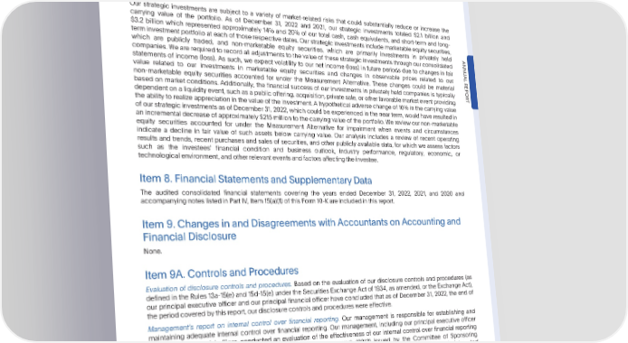 PARTII Item7A.QuantitativeandQualitativeDisclosuresAboutMarketRisk as of December 31, 2021 would have positively impacted income before income taxes by approximately $203 million, resulting in a net positive impact of approximately $7 million. These reasonably possible adverse changes in exchange rates of 10% were applied to monetary assets, monetary liabilities, and available-for-sale debt securities denominated in currencies other than the functional currencies of our subsidiaries at the balance sheet dates to compute the adverse impactthesechangeswouldhavehadonourincomebeforeincometaxesinthenearterm. EquityInvestmentRisk Our strategic investments are subject to a variety of market-related risks that could substantially reduce or increase the carrying value of the portfolio. As of December 31, 2022 and 2021, our strategic investments totaled $2.1 billion and $3.2 billion which represented approximately 14% and 20% of our total cash, cash equivalents, and short-term and long- terminvestmentportfolio at each of those respectivedates. Our strategicinvestmentsinclude marketableequity securities, which are publicly traded, and non-marketable equity securities, which are primarily investments in privately held ANNU companies.Wearerequiredtorecordall adjustmentsto the value of these strategic investments through our consolidated statements of income (loss). As such, we expect volatility to our net income (loss) in future periods due to changes in fair AL value related to our investments in marketable equity securities and changes in observable prices related to our REPOR non-marketable equity securities accounted for under the Measurement Alternative. These changes could be material based on market conditions. Additionally, the financial success of our investments in privately held companies is typically dependentonaliquidityevent,suchasapublicoffering,acquisition,privatesale,or otherfavorablemarketeventproviding T the ability to realize appreciation in the value of the investment. A hypothetical adverse change of 10% in the carrying value of our strategic investments as of December 31, 2022, which could be experiencedin the near term, would have resulted in anincrementaldecreaseof approximately$215 million to the carrying value of the portfolio. We review our non-marketable equity securities accounted for under the Measurement Alternative for impairment when events and circumstances indicate a decline in fair value of such assets below carrying value. Our analysis includes a review of recent operating results and trends, recent purchases and sales of securities, and other publicly available data, for which we assess factors such as the investees financial condition and business outlook, industry performance, regulatory, economic, or technologicalenvironment,andotherrelevanteventsandfactorsaffectingtheinvestee. Item8.FinancialStatementsandSupplementaryData The audited consolidated financial statements covering the years ended December 31, 2022, 2021, and 2020 and accompanyingnoteslistedinPartIV,Item15(a)(1)ofthisForm10-Kareincludedinthisreport. Item9.ChangesinandDisagreementswithAccountantsonAccountingand Financial Disclosure None. Item9A.ControlsandProcedures Evaluation of disclosure controls and procedures. Based on the evaluation of our disclosure controls and procedures (as defined in the Rules 13a-15(e) and 15d-15(e) under the Securities Exchange Act of 1934, as amended, or the Exchange Act), our principal executive officer and our principal financial officer have concluded that as of December 31, 2022, the end of theperiodcoveredbythisreport,ourdisclosurecontrolsandprocedureswereeffective. Managements report on internal control over financial reporting. Our management is responsible for establishing and maintaining adequate internal control over financial reporting. Our management, including our principal executive officer and principal financial officer, conducted an evaluation of the effectiveness of our internal control over financial reporting based on the framework in Internal Control—Integrated Framework (2013) issued by the Committee of Sponsoring Organizations of the Treadway Commission. Based on its evaluation under the framework in Internal Control—Integrated Framework, our managementconcludedthat our internal control over financial reporting was effective as of December 31, 2022. The effectiveness of our internal control over financial reporting as of December 31, 2022 has been audited by PricewaterhouseCoopersLLP, an independent registered public accounting firm, as stated in their report which appears in Item15(a) of this Form 10-K. Changesininternalcontrolsoverfinancialreporting.There were no changesin our internal controls over financial reporting as defined in Exchange Act Rule 13a-15(f) that occurred during our most recently completed fiscal quarter that have materially affected, or are reasonably likely to materially affect, our internal control over financial reporting. •2022AnnualReport 51