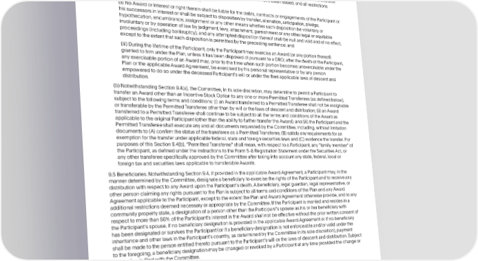 PAYPALHOLDINGS,INC.2015EQUITYINCENTIVEAWARDPLAN(MARKED) 9.4 Limits on Transfer. (a) Except as otherwiseprovidedin Section9.4(b): (i) No AwardunderthePlanmaybesold,pledged,assignedortransferredinanymannerotherthanbywillorthe lawsofdescentanddistributionor,subjecttotheconsentoftheCommittee,pursuanttoaDRO,unlessanduntil suchAwardhasbeenexercised,orthesharesunderlyingsuchAwardhavebeenissued,andallrestrictions applicabletosuchshareshavelapsed; (ii) No Award or interest or right therein shall be liable for the debts, contracts or engagements of the Participant or his successorsin interestor shall be subject to disposition by transfer, alienation, anticipation, pledge, hypothecation,encumbrance,assignmentoranyothermeanswhethersuchdispositionbevoluntaryor involuntary or by operation of law by judgment, levy, attachment,garnishmentor any other legal or equitable proceedings(includingbankruptcy),andanyattempteddispositionthereofshallbenullandvoidandofnoeffect, excepttotheextentthatsuchdispositionispermittedbytheprecedingsentence;and (iii) During the lifetime of the Participant, only the Participant may exercise an Award (or any portion thereof) grantedtohimunderthePlan,unlessithasbeendisposedofpursuanttoaDRO;afterthedeathoftheParticipant, anyexercisableportionofanAwardmay,priortothetimewhensuchportionbecomesunexercisableunderthe PlanortheapplicableAwardAgreement,beexercisedbyhispersonalrepresentativeorbyanyperson empoweredtodosounderthedeceasedParticipantswillorunderthethenapplicablelawsofdescentand distribution. (b) NotwithstandingSection9.4(a), the Committee,in its sole discretion,may determineto permita Participantto transfer an Award other than an IncentiveStock Option to any one or more PermittedTransferees(as definedbelow), subjecttothefollowingtermsandconditions:(i)anAwardtransferredtoaPermittedTransfereeshallnotbeassignable or transferableby the PermittedTransfereeotherthanby will or the laws of descentand distribution;(ii) an Award transferredto a PermittedTransfereeshall continueto be subjectto all the terms and conditionsof the Awardas applicabletotheoriginalParticipant(otherthantheabilityto furthertransferthe Award);and (iii) the Participantand the PermittedTransfereeshallexecuteanyandalldocumentsrequestedbytheCommittee,including,withoutlimitation documentsto(A)confirmthestatusofthetransfereeasaPermittedTransferee,(B)satisfyanyrequirementsforan exemptionforthetransferunderapplicablefederal,stateandforeignsecuritieslawsand(C)evidencethetransfer.For purposesofthisSection9.4(b),“PermittedTransferee”shallmean,withrespecttoaParticipant,any“familymember”of theParticipant,as definedundertheinstructionsto the Form S-8 RegistrationStatementundertheSecuritiesAct,or anyothertransfereespecificallyapprovedbytheCommitteeaftertakingintoaccountanystate,federal,localor foreign tax and securities laws applicableto transferableAwards. 9.5 Beneficiaries.NotwithstandingSection9.4, if providedin the applicableAwardAgreement,a Participantmay,in the mannerdeterminedbytheCommittee,designateabeneficiarytoexercisetherightsoftheParticipantandtoreceiveany distribution with respect to any Award upon the Participantsdeath. A beneficiary,legal guardian, legal representative,or otherpersonclaiminganyrightspursuanttothePlanissubjecttoalltermsandconditionsofthePlanandanyAward AgreementapplicabletotheParticipant,excepttotheextentthePlanandAwardAgreementotherwiseprovide,andtoany additional restrictions deemednecessaryor appropriateby the Committee.If the Participantis marriedand residesin a communitypropertystate,adesignationofapersonotherthantheParticipantsspouseashisorherbeneficiarywith respecttomorethan50%oftheParticipantsinterestintheAwardshallnotbeeffectivewithoutthepriorwrittenconsentof theParticipantsspouse.If no beneficiarydesignationis providedin the applicableAwardAgreementor if no beneficiary hasbeendesignatedorsurvivestheParticipant(orifabeneficiarydesignationisnotenforceableand/orvalidunderthe inheritanceandotherlawsintheParticipantscountry,asdeterminedbytheCommitteeinitssolediscretion),payment shall be madetothepersonentitledtheretopursuanttotheParticipantswillorthelawsofdescentanddistribution.Subject to the foregoing, a beneficiary designationmay be changedor revokedby a Participantat any time providedthe changeor revocationis filed with the Committee. 9.6 Stock Certificates; Book Entry Procedures. (a) Notwithstandinganythinghereinto thecontrary,theCompanyshallnotberequiredtoissueordeliverany certificates or make any book entries evidencingsharesof Stock pursuantto the exerciseof any Award,unless and until the Board has determined,with adviceof counsel,that the issuanceand deliveryof such sharesis in compliance with all applicable laws, regulations of governmentalauthorities and, if applicable,the requirementsof any exchange onwhichthesharesofStockarelistedortraded.AllStockcertificatesdeliveredpursuanttothePlanaresubjecttoany stop-transferordersandotherrestrictionsastheCommitteedeemsnecessaryoradvisabletocomplywithfederal, state, or foreign jurisdiction, securities or other laws, rules and regulations and the rules of any national securities exchangeorautomatedquotationsystemonwhichtheStockislisted,quoted,ortraded.TheCommitteemayplace legendsonanyStockcertificatetoreferencerestrictionsapplicabletotheStock.Inadditiontothetermsand 130 •2023ProxyStatement