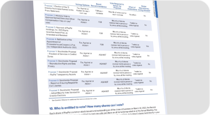 FREQUENTLYASKEDQUESTIONS VotingInformation VotingInformation 9. WhichproposalswillbevotedonattheAnnualMeeting?HowdoestheBoard recommendthatIvote?Whatisthevoterequiredtoapproveeachoftheproposals? Whateffectwillabstentionsandbrokernon-voteshave? PRO XY S VoteRequiredto Broker T A Board Adoptthe Effect of Discretionary TEMENT VotingOptions Recommendation Proposal Abstentions VotingAllowed* Proposal 1: Election of the 12 For, Against or FOReach Majority of votes cast for Director NomineesNamedinthis Abstainfor each nominee suchnominee Noeffect No Proxy Statement nominee Proposal 2: Advisory Vote to Majority of shares ApproveNamedExecutiveOfficer For, Against or FOR representedinpersonor Treated as No Compensation(“say-on-pay” Abstain byproxyatthemeeting votesAgainst vote) Proposal 3: Approval of PayPal Majority of shares Holdings, Inc. 2015 Equity For, Against or FOR representedinpersonor Treated as No Incentive Award Plan, as Abstain byproxyatthemeeting votesAgainst AmendedandRestated Proposal 4: Ratification of the Majority of shares Appointmentof For, Against or FOR representedinpersonor Treated as Yes PricewaterhouseCoopersLLPas Abstain byproxyatthemeeting votesAgainst OurIndependentAuditorfor2023. Proposal 5: Stockholder Proposal For, Against or Majority of shares Treated as –ProvisionofServicesinConflict Abstain AGAINST representedinpersonor votesAgainst No Zones byproxyatthemeeting Proposal 6: Stockholder Proposal For, Against or Majority of shares Treated as –ReproductiveRightsandData Abstain AGAINST representedinpersonor votesAgainst No Privacy byproxyatthemeeting Proposal 7: Stockholder Proposal For, Against or Majority of shares Treated as –PayPalTransparencyReports Abstain AGAINST representedinpersonor votesAgainst No byproxyatthemeeting Proposal 8: Stockholder Proposal For, Against or Majority of shares Treated as –ReportonEnsuringRespectfor Abstain AGAINST representedinpersonor votesAgainst No Civil Liberties byproxyatthemeeting Proposal 9: Stockholder Proposal For, Against or Majority of shares Treated as –AdoptMajorityVoteStandardfor Abstain AGAINST representedinpersonor votesAgainst No Director Elections byproxyatthemeeting * SeeQuestion16belowforadditionalinformationonbrokernon-votes. 10. Whoisentitledtovote?HowmanysharescanIvote? EachshareofPayPalcommonstockissuedandoutstandingasofthecloseofbusinessonMarch30,2023,theRecord DatefortheAnnualMeeting,isentitledtocastonevotepershareonallitemsbeingvotedonattheAnnualMeeting.You mayvoteallsharesofPayPalcommonstockthatyouownedasoftheRecordDate,including(1)shareshelddirectlyinyour nameasthestockholderofrecord,includingsharespurchasedoracquiredthroughPayPalsequityincentiveplansand (2) shares held for you as the beneficial owner through a broker, bank or other nominee. OntheRecordDate,1,122,806,008sharesofPayPalcommonstockwereissuedandoutstandingandentitledtovote. •2023ProxyStatement 111