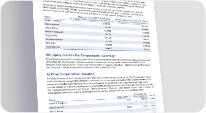 COMPENSATIONTABLES 2022SummaryCompensationTable StockAwards–Column(e) AmountsshownrepresentthegrantdatefairvalueofRSUsandPBRSUs(includingPBRSUsunderthe2022AIP)grantedto eachofourNEOsascomputedinaccordancewithFASBASCTopic718.ThegrantdatefairvalueofRSUsisdetermined usingthefair value of the underlying commonstockonthegrantdate. TheassumptionsusedbytheCompanyincalculatingthegrantdatefairvalueofthestockawardsareincorporatedherein byreferencetoNote15totheconsolidatedfinancialstatementscontainedintheCompanys2022AnnualReportonForm 10-K. The estimatedfair value of PBRSUs is calculatedbasedon the probableoutcomeof theperformancemeasuresfor theapplicableperformanceperiodasofthegrantdateoftheawardforaccountingpurposes. Assumingthehighestlevelofperformanceisachievedundertheapplicableperformancemeasuresforthe2022AIP PBRSUsandthe2022-2024PBRSUs,themaximumpossiblevalueoftheawardsusingthefairvalueoftheunderlying commonstockonthedatethattheawardsweregrantedforaccountingpurposesispresentedbelow: MaximumValueof2022AIPPBRSUs MaximumValueof2022-2024AIPPBRSUs Name (as of Grant Date for Accounting Purposes)($) (as of Grant Date for Accounting Purposes)($) DanielH.Schulman 2,705,228 18,830,116 BlakeJorgensen 591,896 2,008,012 JohnD.Rainey 1,014,432 7,845,953 Gabrielle Rabinovitch 365,315 4,938,669 PeggyAlford 1,014,432 7,845,953 JonathanAuerbach 1,014,432 7,845,953 MarkBritto 1,014,432 11,768,929 AaronKarczmer 1,014,432 7,845,953 Non-EquityIncentivePlanCompensation–Column(g) Amountsrepresentcash(non-equity)performance-basedcompensationearnedundertheindividualperformanceportion of the 2022 AIP. The CompanyperformanceportionoftheannualincentivepayoutwasdeliveredinPBRSUsandis reflectedin the “Stock Awards”column.See“CompensationDiscussionandAnalysis–2022CompensationFramework andDecisions–AnnualIncentivePlan”aboveforamoredetaileddiscussion. All OtherCompensation–Column(i) Thedollaramountsforeachperquisiteandeachotheritemofcompensationshowninthe“AllOtherCompensation”column andinthisfootnoterepresenttheCompanysincrementalcostofprovidingtheperquisiteorotherbenefittoourNEOs,netof anyamountsreimbursedbyourNEOsandarevaluedbasedontheamountsaccruedforpaymentorpaidtotheservice provider or NEO, or, in the case of perquisites or other benefits, the aggregate incremental cost to the Company, as applicable. See“CompensationDiscussionandAnalysis–OtherCompensationElements–OtherBenefits”aboveforadditionaldetailson thesebenefits. AmountsincludethefollowingperquisitesandothercompensationprovidedtoourNEOsin2022. Perquisitesand 1 Name 401(k) Match ($) OtherBenefits($) Total ($) 2 DanielH.Schulman 12,200 200,492 212,692 BlakeJorgensen ——— 3 JohnD.Rainey 12,200 16,864 29,064 Gabrielle Rabinovitch ——— PeggyAlford 12,200 — 12,200 JonathanAuerbach ——— MarkBritto 12,200 — 12,200 AaronKarczmer 12,200 — 12,200 1 RepresentsmatchingcontributionsundertheCompany401(k)Plan. 2 RepresentscostsrelatedtoMr.Schulmansoverallsecurityprogram,whichconsistedofthefollowing: • Costsof$165,134relatedtotheprocurement,installationandmaintenanceofpersonalsecuritymeasuresforMr.Schulman. • Costsof$35,358relatedtopersonaluseofourcorporateaircraft,calculatedbasedontheaggregateincrementalcosttotheCompany.Includesfuelcosts,landingandparking fees, in-flight catering, crew expenses, en route navigation fees and internationalhandling fees, as applicable. 3 RepresentsthepaymentofMr.RaineysaccruedpaidtimeoffuponhisresignationfromtheCompany. 72 •2023ProxyStatement