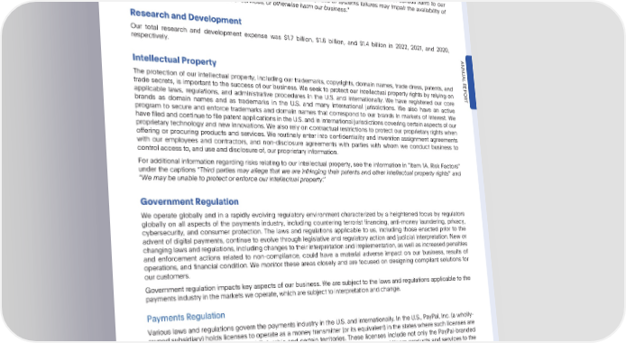 PARTI Item1. Business threats, which includes regularly testing our systems to identify and address potential vulnerabilities. We strive to continually improve our technology infrastructure and payments platform to enhance the customer experience and to increaseefficiency,scalability,and security. For additional information regarding risks relating to our technology infrastructure and cybersecurity, see the information in “Item 1A. Risk Factors” under the captions “Cyberattacks and security vulnerabilities could result in serious harm to our reputation, business, and financial condition” and “Business interruptions or systems failures may impair the availability of ourwebsites,applications,productsorservices,orotherwiseharmourbusiness.” ResearchandDevelopment Our total research and development expense was $1.7 billion, $1.6 billion, and $1.4 billion in 2022, 2021, and 2020, respectively. ANNU IntellectualProperty AL The protection of our intellectual property, including our trademarks, copyrights, domain names, trade dress, patents, and REPOR trade secrets, is important to the success of our business. We seek to protect our intellectual property rights by relying on applicable laws, regulations, and administrative procedures in the U.S. and internationally. We have registered our core T brands as domain names and as trademarks in the U.S. and many international jurisdictions. We also have an active program to secure and enforce trademarks and domain names that correspond to our brands in markets of interest. We havefiled and continueto file patent applicationsin the U.S. and in internationaljurisdictionscovering certain aspects of our proprietary technology and new innovations. We also rely on contractual restrictions to protect our proprietary rights when offering or procuring products and services. We routinely enter into confidentiality and invention assignment agreements with our employees and contractors, and non-disclosure agreements with parties with whom we conduct business to control accessto, and use and disclosureof, our proprietaryinformation. For additional information regarding risks relating to our intellectual property, see the information in “Item 1A. Risk Factors” under the captions “Third parties may allege that we are infringing their patents and other intellectual property rights” and “Wemaybeunabletoprotectorenforceourintellectualproperty.” GovernmentRegulation Weoperate globally and in a rapidly evolving regulatory environment characterized by a heightened focus by regulators globally on all aspects of the payments industry, including countering terrorist financing, anti-money laundering, privacy, cybersecurity, and consumer protection. The laws and regulations applicable to us, including those enacted prior to the advent of digital payments, continue to evolve through legislative and regulatory action and judicial interpretation. New or changinglawsandregulations,includingchangestotheirinterpretationandimplementation,aswellasincreasedpenalties and enforcement actions related to non-compliance, could have a material adverse impact on our business, results of operations, and financial condition. We monitor these areas closely and are focused on designing compliant solutions for ourcustomers. Government regulation impacts key aspects of our business. We are subject to the laws and regulations applicable to the paymentsindustryinthemarketsweoperate,whicharesubjecttointerpretationandchange. PaymentsRegulation Various laws and regulations govern the payments industry in the U.S. and internationally. In the U.S., PayPal, Inc. (a wholly- ownedsubsidiary)holdslicensesto operateas a money transmitter(or its equivalent)in the states where such licenses are required, as well as in the District of Columbia and certain territories. These licenses include not only the PayPal-branded products and services offered in these locations, but also our Venmo, Hyperwallet, and Xoom products and services to the extent offered in these locations. As a licensed money transmitter, PayPal is subject to, among other requirements, restrictions with respect to the investment of customer funds, reporting requirements, bonding requirements, and inspection by state regulatory agencies. In certain cases, these licenses also generally cover PayPals service enabling customers to buy, hold, transfer, and sell cryptocurrency directly from their PayPal or Venmo account. In the State of New York, PayPal holds a full Bitlicense issued by the New York Department of Financial Services to offer cryptocurrency servicesin the state. Outside the U.S., we provide similar services customized for various countries and foreign jurisdictions through our foreign subsidiaries. The activities of those non-U.S. entities are, or may be, supervised by a financial regulatory authority in the jurisdictions in which they operate. Among other regulatory authorities, the Luxembourg Commission de Surveillance du •2022AnnualReport 9