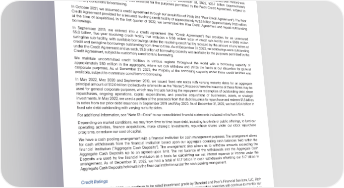 PARTII Item7. ManagementsDiscussionandAnalysisofFinancialConditionandResultsofOperations AvailableCreditandDebt In February 2022, we entered into a credit agreement (the “Paidy Credit Agreement”) with Paidy as co-borrower, which provides for an unsecured revolving credit facility of ¥60.0 billion. In September 2022, the Paidy Credit Agreement was modified to increase the borrowing capacity by ¥30.0 billion for a total borrowing capacity of ¥90.0 billion (approximately $686millionasofDecember31,2022).IntheyearendedDecember31,2022,¥64.3billion(approximately$491million)was drawn down under the Paidy Credit Agreement. Accordingly, at December 31, 2022, ¥25.7 billion (approximately $195 million) of borrowing capacity was available for the purposes permitted by the Paidy Credit Agreement, subject to customaryconditionstoborrowing. In October 2021, we assumed a credit agreement through our acquisition of Paidy (the “Prior Credit Agreement”). The Prior Credit Agreement provided for a secured revolving credit facility of approximately ¥22.8 billion (approximately $198 million at the time of acquisition). In the first quarter of 2022, we terminated the Prior Credit Agreement and repaid outstanding borrowings. In September 2019, we entered into a credit agreement (the “Credit Agreement”) that provides for an unsecured $5.0 billion, five-year revolving credit facility that includes a $150 million letter of credit sub-facility and a $500 million swingline sub-facility, with available borrowings under the revolving credit facility reduced by the amount of any letters of credit and swingline borrowings outstanding from time to time. As of December 31, 2022, no borrowings were outstanding undertheCreditAgreementandassuch,$5.0billionofborrowingcapacitywasavailableforthepurposespermittedbythe Credit Agreement,subjecttocustomaryconditionstoborrowing. We maintain uncommitted credit facilities in various regions throughout the world with a borrowing capacity of approximately $80 million in the aggregate, where we can withdraw and utilize the funds at our discretion for general corporate purposes. As of December 31, 2022, the majority of the borrowing capacity under these credit facilities was available, subject to customary conditionsto borrowing. In May 2022, May 2020 and September 2019, we issued fixed rate notes with varying maturity dates for an aggregate principal amount of $12.0 billion (collectively referred to as the “Notes”). Proceeds from the issuance of these Notes may be used for general corporate purposes, which may include funding the repayment or redemption of outstanding debt, share repurchases, ongoing operations, capital expenditures, and possible acquisitions of businesses, assets, or strategic investments.In May 2022, weusedaportionoftheproceedsfromthatdebtissuancetorepurchaseandredeem$1.6billion in notes from our prior debt issuances in September 2019 and May 2020. As of December 31, 2022, we had $10.4 billion in fixed rate debt outstandingwith varying maturity dates. Foradditionalinformation,see“Note12—Debt”toourconsolidatedfinancialstatementsincludedinthisForm10-K. Dependingonmarketconditions,we may from time to time issue debt, including in private or public offerings, to fund our operating activities, finance acquisitions, make strategic investments, repurchase shares under our stock repurchase programs,orreduceourcostofcapital. Wehaveacashpooling arrangement with a financial institution for cash management purposes. The arrangement allows for cash withdrawals from the financial institution based upon our aggregate operating cash balances held within the financial institution (“Aggregate Cash Deposits”). The arrangement also allows us to withdraw amounts exceeding the Aggregate Cash Deposits up to an agreed-upon limit. The net balance of the withdrawals and the Aggregate Cash Deposits are used by the financial institution as a basis for calculating our net interest expense or income under the arrangement. As of December 31, 2022, we had a total of $1.7 billion in cash withdrawals offsetting our $1.7 billion in AggregateCashDepositsheldwithinthefinancialinstitutionunderthecashpoolingarrangement. CreditRatings Asof December31, 2022, we continue to be rated investment grade by Standard and Poors Financial Services, LLC, Fitch Ratings, Inc., and Moodys Investors Services Inc. We expect that these credit rating agencies will continue to monitor our performance, including our capital structure and results of operations. Our goal is to be rated investment grade, but as circumstances change, there are factors that could result in our credit ratings being downgraded or put on a watch list for possible downgrading.If that were to occur, it could increase our borrowing rates, including the interest rate on borrowings underourcreditagreements. CurrentandFutureCashRequirements Our material cash requirements include funds to support current and potential: operating activities, credit products, customer protection programs, stock repurchases, strategic investments, acquisitions, other commitments, and capital expendituresandotherfutureobligations. 44 •2022AnnualReport