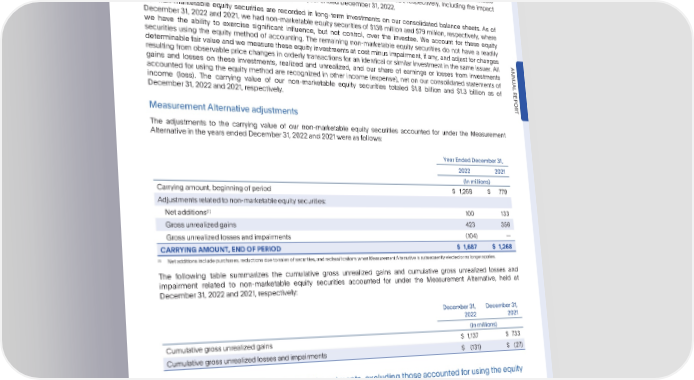 PARTIV Note8—FundsReceivableandCustomerAccountsandInvestments PayPalHoldings,Inc. NotestoConsolidatedFinancialStatements—(Continued) changesinfair value recordedin other income (expense), net on our consolidated statements of income (loss). Marketable equity securities totaled $323 million and $1.9 billion as of December 31, 2022 and 2021, respectively, including the impact of the sale of marketableequity securitiesduring the year ended December31, 2022. Our non-marketable equity securities are recorded in long-term investments on our consolidated balance sheets. As of December31,2022and2021,wehadnon-marketableequitysecuritiesof $136 million and $79 million, respectively,where we have the ability to exercise significant influence, but not control, over the investee. We account for these equity securities using the equity method of accounting. The remaining non-marketable equity securities do not have a readily determinable fair value and we measure these equity investments at cost minus impairment, if any, and adjust for changes resulting from observable price changes in orderly transactions for an identical or similar investment in the same issuer. All ANNU gains and losses on these investments, realized and unrealized, and our share of earnings or losses from investments accounted for using the equity method are recognized in other income (expense), net on our consolidated statements of AL income (loss). The carrying value of our non-marketable equity securities totaled $1.8 billion and $1.3 billion as of REPOR December31,2022and2021,respectively. T MeasurementAlternativeadjustments The adjustments to the carrying value of our non-marketable equity securities accounted for under the Measurement Alternativein the years ended December31, 2022and2021wereasfollows: YearEndedDecember31, 2022 2021 (In millions) Carryingamount,beginningofperiod $ 1,268 $ 779 Adjustmentsrelatedtonon-marketableequitysecurities: (1) Netadditions 100 133 Grossunrealizedgains 423 356 Grossunrealizedlossesandimpairments (104) — CARRYINGAMOUNT,ENDOFPERIOD $ 1,687 $ 1,268 (1) Netadditionsincludepurchases,reductionsduetosalesofsecurities,andreclassificationswhenMeasurementAlternativeissubsequentlyelectedornolongerapplies. The following table summarizes the cumulative gross unrealized gains and cumulative gross unrealized losses and impairment related to non-marketable equity securities accounted for under the Measurement Alternative, held at December31,2022and2021,respectively: December31, December31, 2022 2021 (In millions) Cumulativegrossunrealizedgains $ 1,137 $ 733 Cumulativegrossunrealizedlossesandimpairments $ (131) $ (27) Unrealizedgains(losses)onstrategicinvestments,excludingthoseaccountedforusingtheequity method The following table summarizes the net unrealized gains (losses) on marketable and non-marketable equity securities, excludingthoseaccountedforusingtheequitymethod,heldatDecember31,2022and2021,respectively: YearEndedDecember31, 2022 2021 (In millions) Netunrealizedgains(losses) $ 79 $ (46) •2022AnnualReport 89