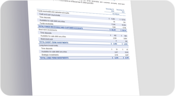 PARTIV Note8—FundsReceivableandCustomerAccountsandInvestments PayPalHoldings,Inc. NotestoConsolidatedFinancialStatements—(Continued) Note8—FundsReceivableandCustomerAccountsandInvestments The following table summarizes the assets underlying our funds receivable and customer accounts, short-term investments,andlong-terminvestmentsasofDecember31,2022and2021: December31, December31, 2022 2021 (In millions) Fundsreceivableandcustomeraccounts: Cashandcashequivalents $ 11,363 $ 12,723 Timedeposits 95 334 Available-for-saledebt securities 17,349 18,336 Fundsreceivable 7,550 4,748 TOTALFUNDSRECEIVABLEANDCUSTOMERACCOUNTS $ 36,357 $ 36,141 Short-terminvestments: Timedeposits $ 482 $ 590 Available-for-saledebt securities 2,593 3,604 Restrictedcash 17 109 TOTALSHORT-TERMINVESTMENTS $ 3,092 $ 4,303 Long-terminvestments: Timedeposits $55$45 Available-for-saledebt securities 2,817 3,545 Strategic investments 2,146 3,207 TOTALLONG-TERMINVESTMENTS $ 5,018 $ 6,797 84 •2022AnnualReport