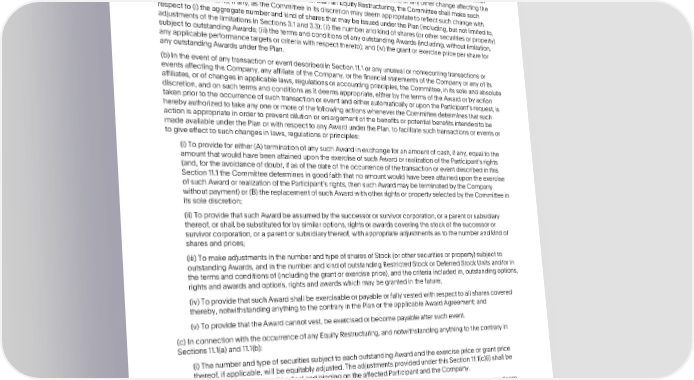 PAYPALHOLDINGS,INC.2015EQUITYINCENTIVEAWARDPLAN(MARKED) ARTICLE11 ChangesinCapitalStructure 11.1 Adjustments. (a) In the event of any stock dividend, stock split, combination or exchange of shares, merger, consolidationor other distribution (other than normal cash dividends)of Companyassetsto stockholders,or any other changeaffectingthe sharesofStockorthesharepriceoftheStockotherthananEquityRestructuring,theCommitteeshallmakesuch equitableadjustments,if any, as the Committeein its discretionmay deemappropriateto reflectsuchchangewith respectto(i) the aggregatenumberandkindofsharesthatmaybeissuedunderthePlan(including,butnotlimitedto, adjustmentsofthelimitationsin Sections3.1 and3.3); (ii) the number and kind of shares (or other securitiesor property) subjecttooutstandingAwards;(iii) the termsandconditionsof anyoutstandingAwards(including,withoutlimitation, anyapplicableperformancetargetsorcriteriawithrespectthereto);and(iv)thegrantorexercisepricepersharefor anyoutstandingAwardsunderthePlan. (b) In the event of any transaction or event describedin Section 11.1 or any unusual or nonrecurringtransactionsor eventsaffectingtheCompany,anyaffiliateoftheCompany,orthefinancialstatementsoftheCompanyoranyofits affiliates, or of changes in applicable laws, regulations or accounting principles, the Committee, in its sole and absolute discretion, and on such terms and conditionsas it deems appropriate,either by the terms of the Award or by action takenpriortotheoccurrenceofsuchtransactionoreventandeitherautomaticallyorupontheParticipantsrequest,is herebyauthorizedtotakeanyoneormoreofthefollowingactionswhenevertheCommitteedeterminesthatsuch actionis appropriatein order to preventdilution or enlargementof the benefitsor potentialbenefitsintendedto be madeavailableunderthePlanorwithrespecttoanyAwardunderthePlan,tofacilitatesuchtransactionsoreventsor to give effect to such changesin laws, regulations or principles: (i) To provide for either (A) termination of any such Award in exchange for an amount of cash, if any, equal to the amountthatwouldhavebeenattainedupontheexerciseofsuchAwardorrealizationoftheParticipantsrights (and, for the avoidanceof doubt, if as of the date of the occurrenceof the transactionor event describedin this Section11.1 the Committeedeterminesingoodfaiththatnoamountwouldhavebeenattainedupontheexercise of such Awardorrealizationof the Participantsrights, then such Award may be terminatedby the Company withoutpayment)or(B)thereplacementofsuchAwardwithotherrightsorpropertyselectedbytheCommitteein its sole discretion; (ii) To provide that such Award be assumedby the successoror survivorcorporation,or a parentor subsidiary thereof, or shall be substituted for by similar options, rights or awards covering the stock of the successor or survivor corporation,or a parent or subsidiary thereof, with appropriateadjustmentsas to the number and kind of sharesandprices; (iii) To make adjustmentsin the number and type of shares of Stock (or other securitiesor property) subject to outstandingAwards,andinthenumberandkindofoutstandingRestrictedStockorDeferredStockUnitsand/orin thetermsandconditionsof(includingthegrantorexerciseprice),andthecriteriaincludedin,outstandingoptions, rights and awardsandoptions,rightsandawardswhichmaybegrantedinthefuture; (iv) To provide that such Award shall be exercisableor payable or fully vested with respect to all shares covered thereby,notwithstandinganythingtothecontraryinthePlanortheapplicableAwardAgreement;and (v) To provide that the Award cannot vest, be exercisedor becomepayableaftersuchevent. (c) In connectionwith the occurrenceof any Equity Restructuring,and notwithstandinganythingto the contraryin Sections11.1(a) and 11.1(b): (i) The number and type of securitiessubject to each outstandingAwardand the exercisepriceor grantprice thereof, if applicable, will be equitably adjusted. The adjustments provided under this Section 11.1(c)(i) shall be nondiscretionaryandshallbefinalandbindingontheaffectedParticipantandtheCompany. (ii) The Committeeshall make such equitableadjustments,if any, as the Committeein its discretionmay deem appropriateto reflect such Equity Restructuringwith respectto the aggregatenumberand kind of sharesthat may beissuedunderthePlan(including,butnotlimitedto,adjustmentsofthelimitationsinSections3.1and3.3). (iii) To the extent that such equitable adjustments result in tax consequencesto the Participant,the Participantshall beresponsibleforpaymentofsuchtaxesandshallnotbecompensatedforsuchpaymentsbytheCompanyorits Subsidiaries. (d) The existenceof the Plan, the Award AgreementandtheAwardsgrantedhereundershallnotaffectorrestrictinany waytherightorpoweroftheCompanyorthestockholdersoftheCompanytomakeorauthorizeanyadjustment, recapitalization,reorganizationor other change in the Companyscapitalstructureor its business,any mergeror 132 •2023ProxyStatement