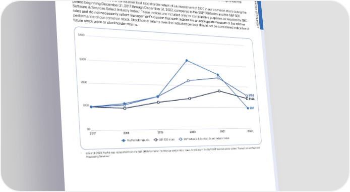 STOCKPERFORMANCEGRAPH StockPerformanceGraph This performancegraphshallnotbedeemed“solicitingmaterial”ortobe“filed”withtheSecuritiesandExchange Commission(the“SEC”)forpurposesofSection18oftheSecuritiesExchangeActof1934,orotherwisesubjecttothe liabilities under that Section, and shall not be deemed to be incorporatedby referenceinto any of our filings under the PRO Securities Act of 1933. XY S T Thegraphbelowshowsthecumulativetotalstockholderreturnofaninvestmentof$100inourcommonstockduringthe A periodbeginningDecember31,2017throughDecember31,2022,comparedtotheS&P500IndexandtheS&P500 TEMENT 1 Software&ServicesSelectIndustryIndex. TheseindicesareincludedonlyforcomparativepurposesasrequiredbySEC rules and do not necessarilyreflect managementsopinionthatsuchindicesareanappropriatemeasureoftherelative performanceofourcommonstock.Stockholderreturnsovertheindicatedperiodsshouldnotbeconsideredindicativeof future stock price or stockholder returns. $400 $300 $200 $158 $144 $100 $97 $0 2017 2018 2019 2020 2021 2022 PayPal Holdings, Inc. S&P 500 Index S&P Software & Services Select Industry Index 1 In March2023,PayPalwasreclassifiedfromtheS&P500InformationTechnologysectorintoanewsub-industryintheS&P500Financialssectorcalled“TransactionandPayment ProcessingServices.”