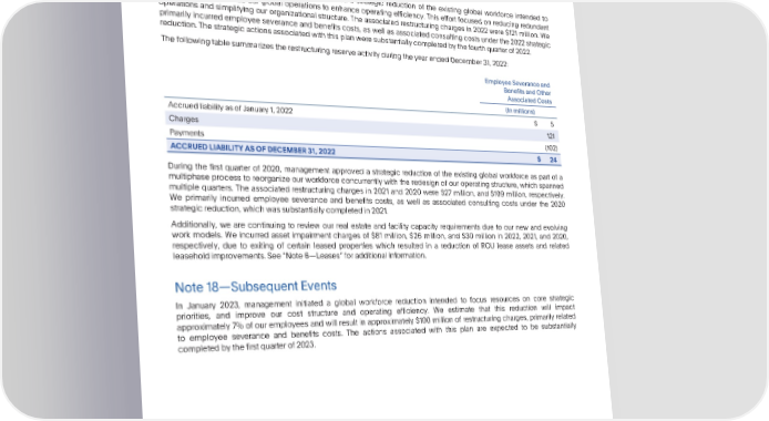 PARTIV Note17—RestructuringandOtherCharges PayPalHoldings,Inc. NotestoConsolidatedFinancialStatements—(Continued) Note17—RestructuringandOtherCharges During the first quarter of 2022, management initiated a strategic reduction of the existing global workforce intended to streamline and optimize our global operations to enhance operating efficiency. This effort focused on reducing redundant operations and simplifying our organizational structure. The associated restructuring charges in 2022 were $121 million. We primarily incurred employee severance and benefits costs, as well as associated consulting costs under the 2022 strategic reduction.Thestrategicactionsassociatedwiththisplanweresubstantiallycompletedbythefourthquarterof2022. ThefollowingtablesummarizestherestructuringreserveactivityduringtheyearendedDecember31,2022: EmployeeSeveranceand BenefitsandOther AssociatedCosts (In millions) Accruedliability as of January 1, 2022 $5 Charges 121 Payments (102) ACCRUEDLIABILITYASOFDECEMBER31,2022 $24 During the first quarter of 2020, management approved a strategic reduction of the existing global workforce as part of a multiphase process to reorganize our workforce concurrently with the redesign of our operating structure, which spanned multiple quarters. The associated restructuring charges in 2021 and 2020 were $27 million, and $109 million, respectively. We primarily incurred employee severance and benefits costs, as well as associated consulting costs under the 2020 strategic reduction, which was substantiallycompletedin 2021. Additionally, we are continuing to review our real estate and facility capacity requirements due to our new and evolving work models. We incurred asset impairment charges of $81 million, $26 million, and $30 million in 2022, 2021, and 2020, respectively, due to exiting of certain leased properties which resulted in a reduction of ROU lease assets and related leaseholdimprovements.See“Note6—Leases”foradditionalinformation. Note18—SubsequentEvents In January 2023, management initiated a global workforce reduction intended to focus resources on core strategic priorities, and improve our cost structure and operating efficiency. We estimate that this reduction will impact approximately 7% of our employees and will result in approximately $100 million of restructuring charges, primarily related to employee severance and benefits costs. The actions associated with this plan are expected to be substantially completedbythefirstquarterof2023. 116 •2022AnnualReport